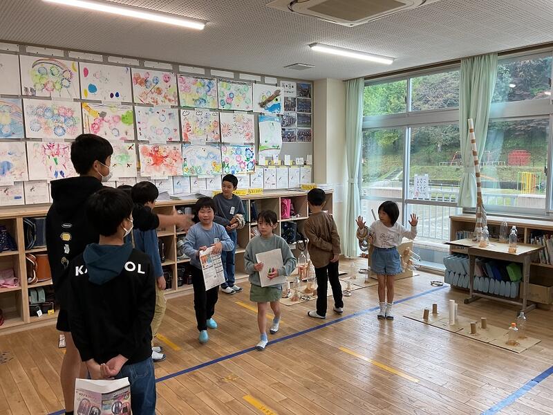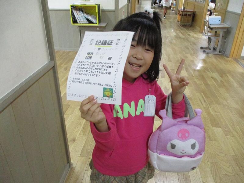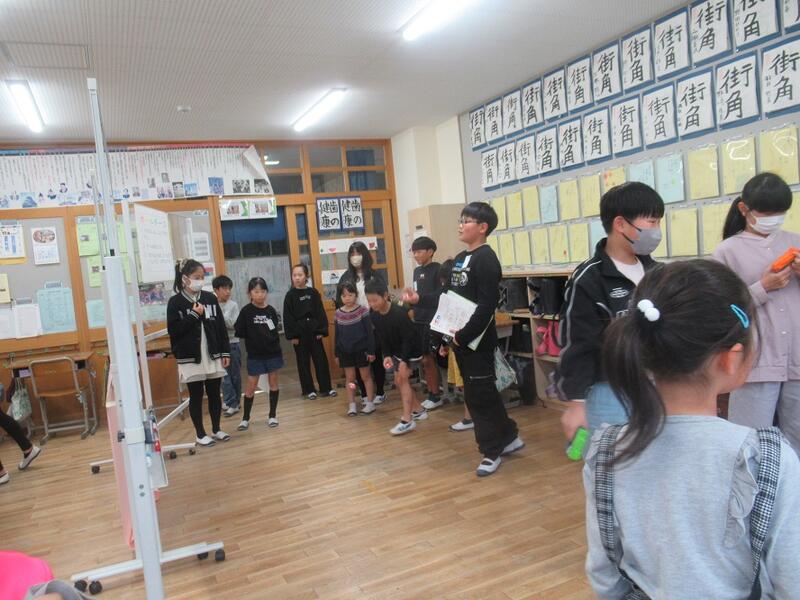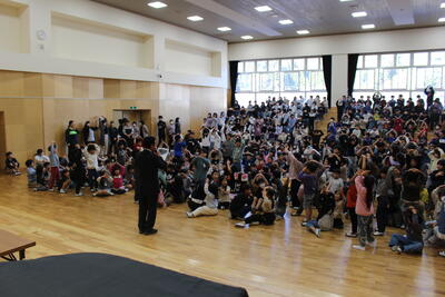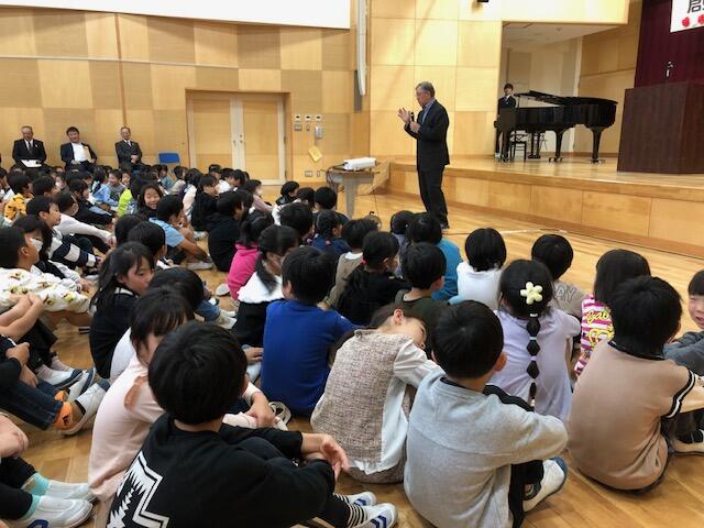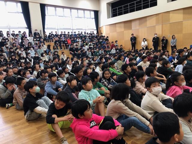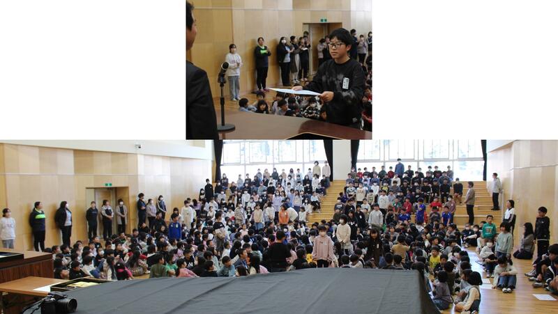 校長先生のお話では、創立10周年記念イベントのパンフレットにあった「君も石川小マイスター 10周年おめでとう ◯×クイズ」の答え合わせをしました。(正解は、「学校の前を流れる川の名前は「北須川」である。」だけが「×」で、そのほかは◯でした。)