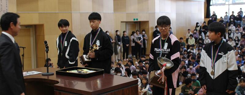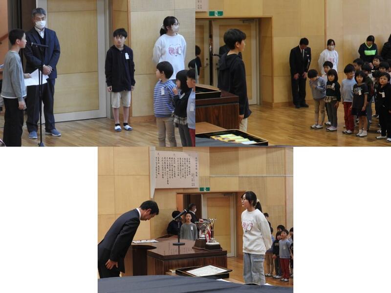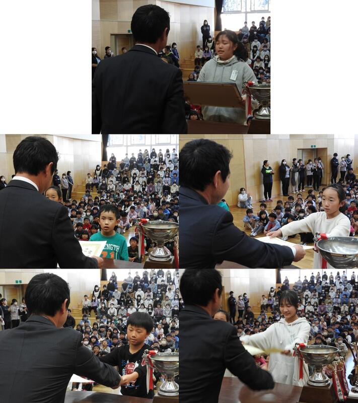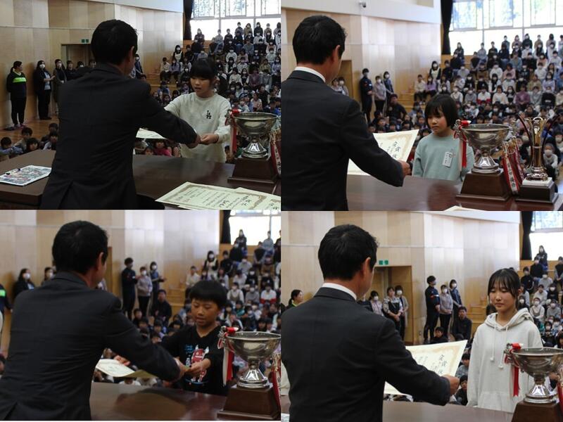 全校集会で、「火災予防絵画・ポスターコンクール」「青少年読書感想文福島県コンクール」「福島県理科作品展」「東邦カップ福島リレーズ」「石川地区児童図画作品展」の表彰を行いました。