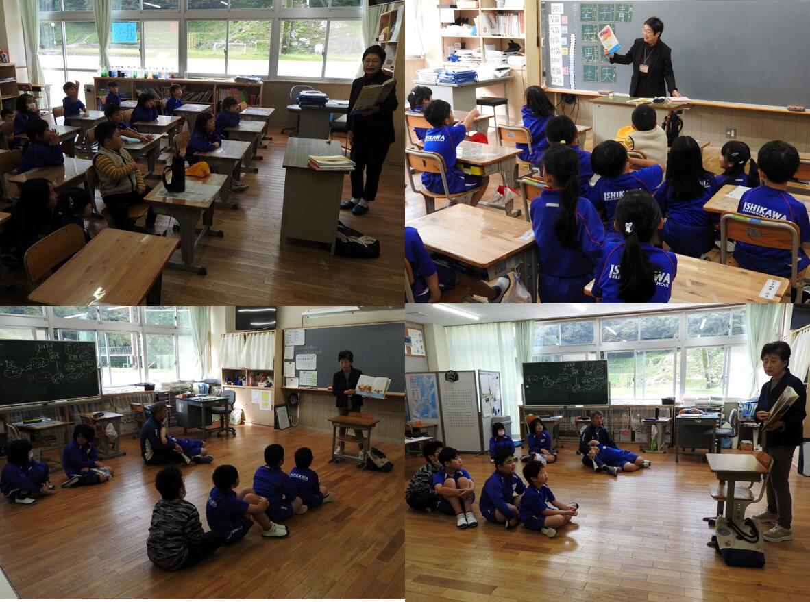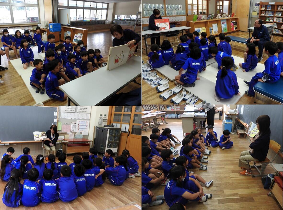 1年生のうち1学級は交代で教室前のオープンスペース「ほんのもり」も活用して読み聞かせをしています。