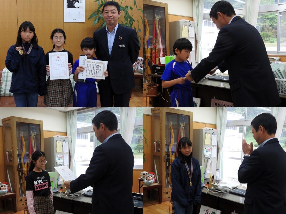「書道展」「ピアノコンクール」「軟式野球」で優秀な成績を修めた児童への表彰が校長室で行われました。