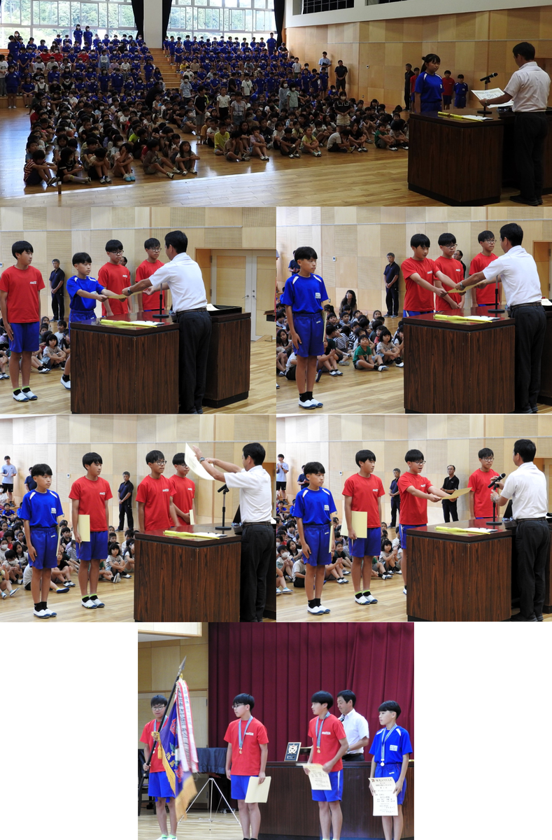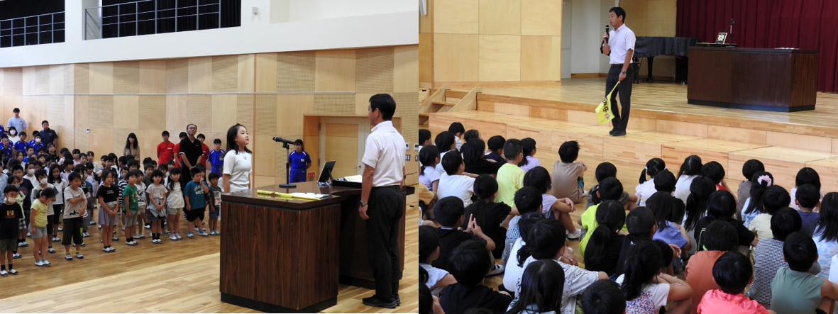 全校集会で、合奏部が参加した「TBC 福島県こども音楽コンクール」と陸上部が参加した「県小学生リレーカーニバル」