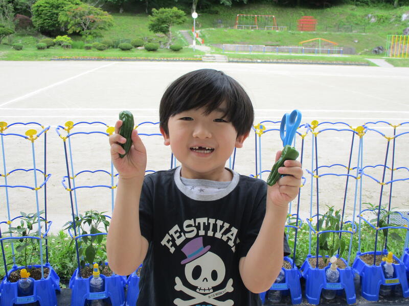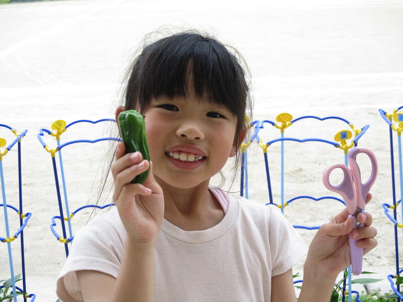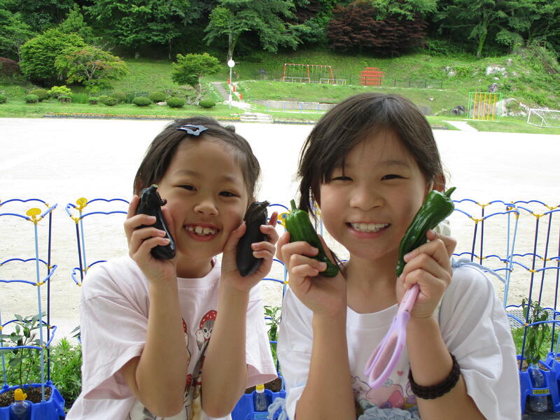 今年は様々な野菜作りに挑戦中の2年生、ナント、ナスやピーマンはもう収穫が始まりました。野菜とったどー!