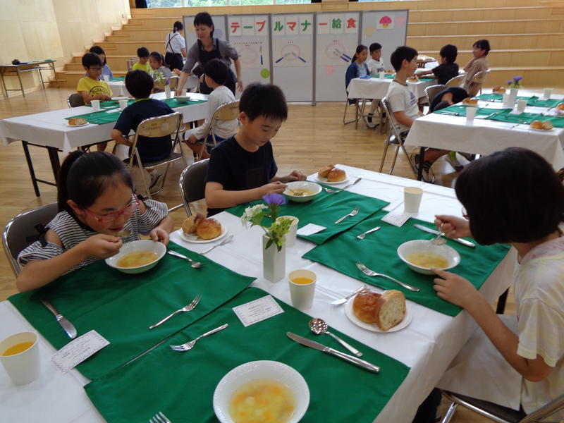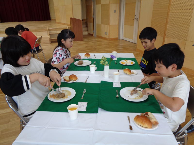 今日から3日間、クラスごとに、クリスタルホールを会場としいぇ、テーブルマナーを実施します。今日は5年1組のテーブルマナーです。メニューは、はちみつ牛ハンバーグをメインディッシュに、パン、ポテトスープ、デザートです。