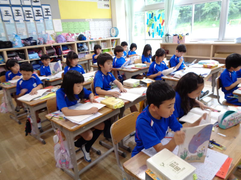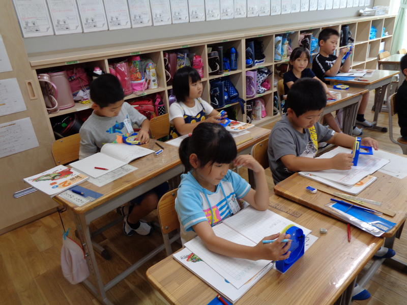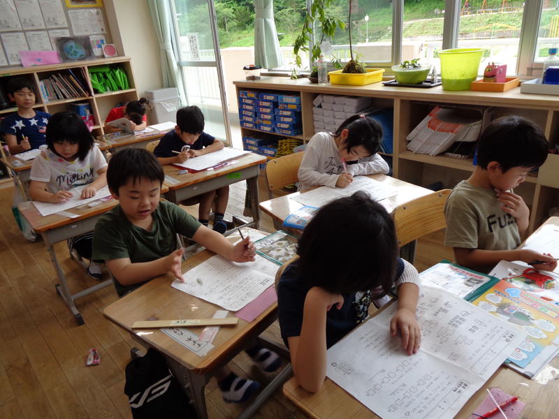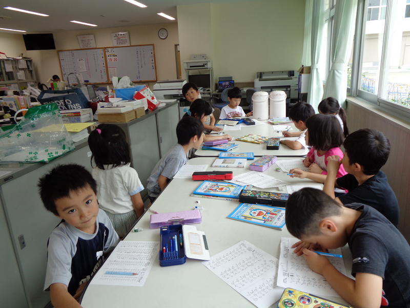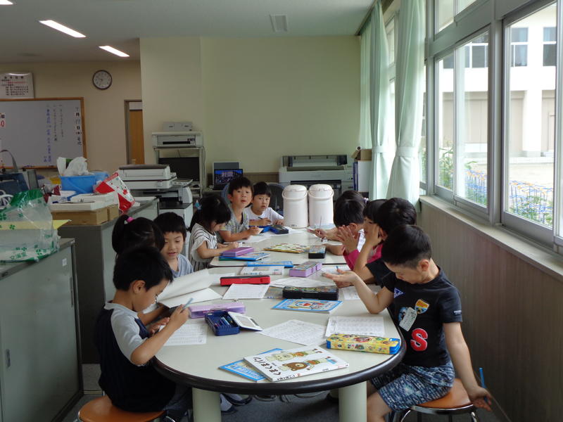 水泳学習で、健康上などの理由などでプールには入れない児童は、職員室でプリント学習に取り組んでいます。1年生は、ひき算の問題に取り組んでいました。みんな一生懸命頑張っていました。