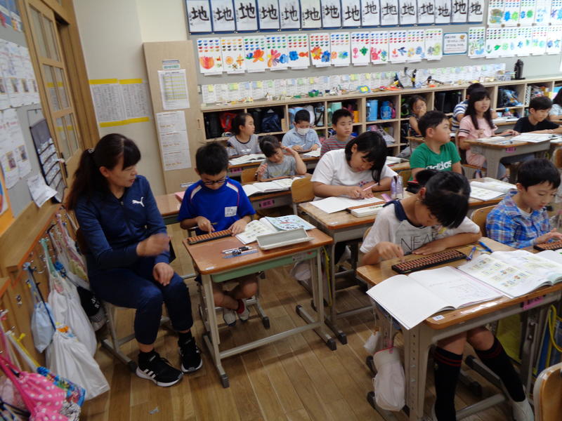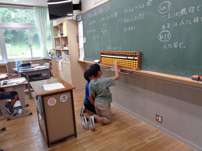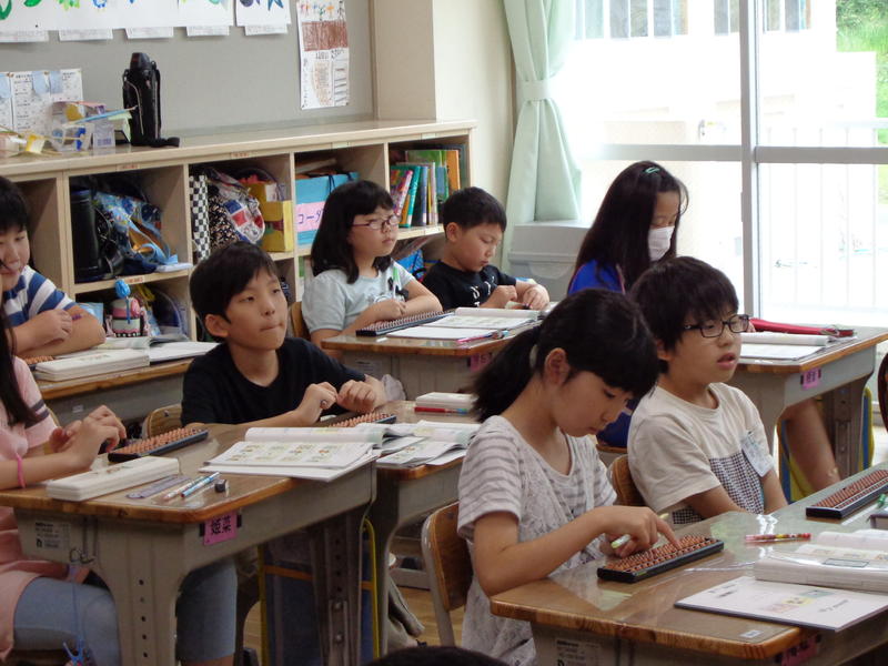 2019年7月16日 14時06分4年生のそろばん学習の様子です。そろばんを使う機会は、今はほとんどないですが、そろばんの考え方は、算数の計算力を育てる上でも大切だと思います。8-4のやり方について、みんなで考えているところです。