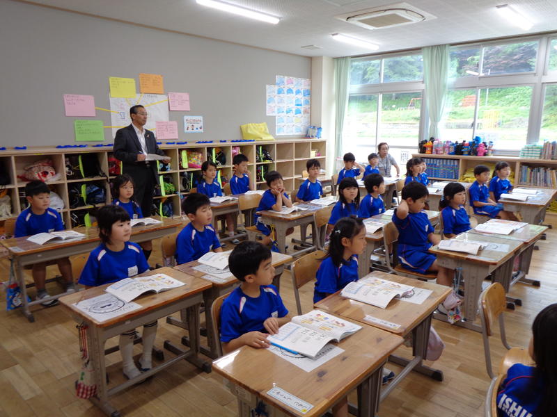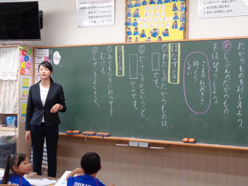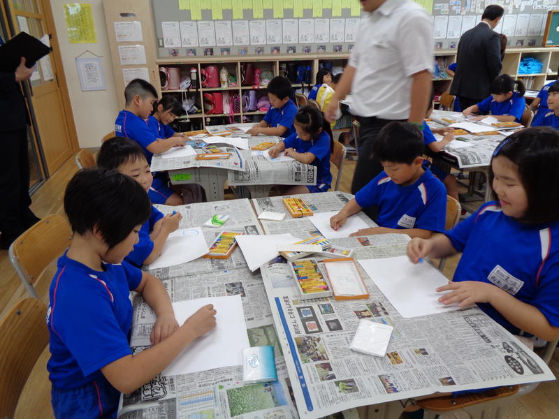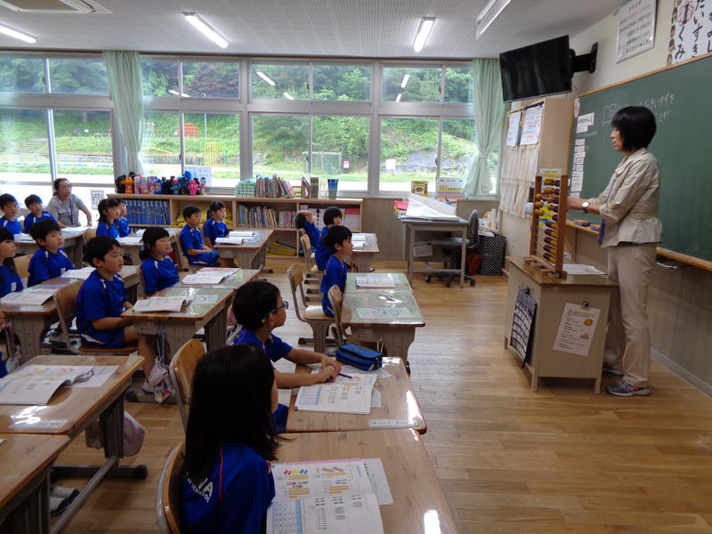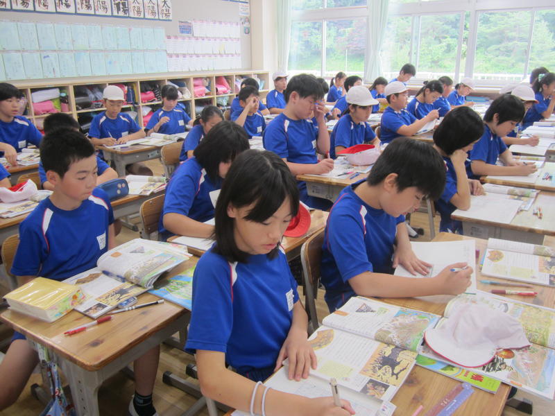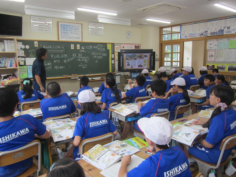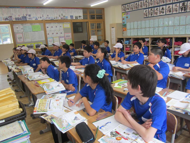6年生の社会の学習の様子です。6年1組の先生が6年2組の子ども達を指導しています。その時間に、6年2組の先生は、6年1組の子ども達に音楽を指導しています。6年1組では、天下統一について学習していました。