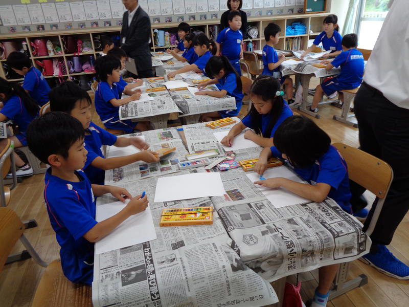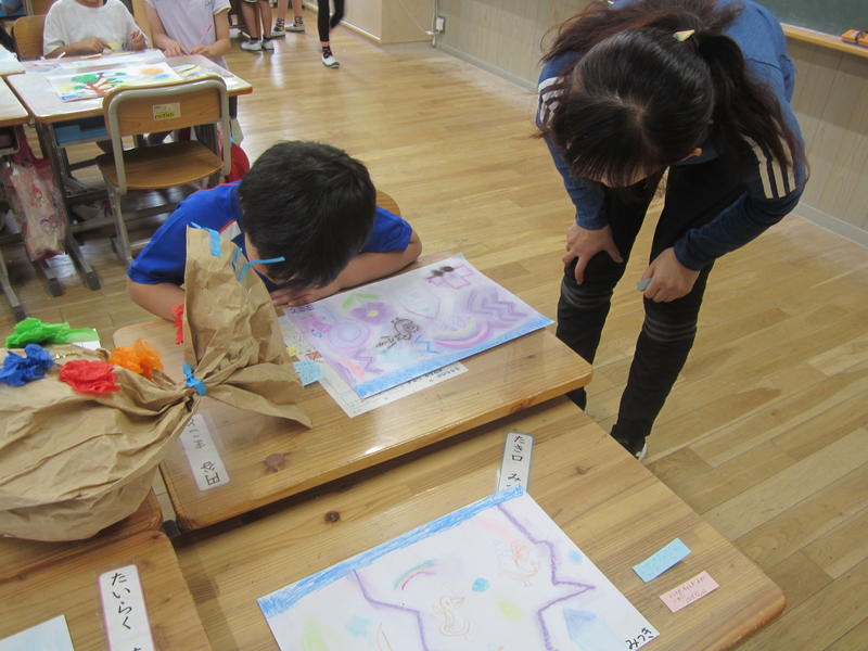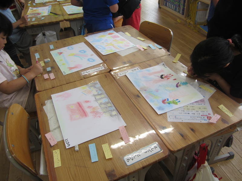 2年生では、コンテで絵を描いて、ティッシュでこすって淡い色を出して、ファンタジー的な雰囲気を出す絵に仕上げていました。とてもすてきな絵がたくさんありました。