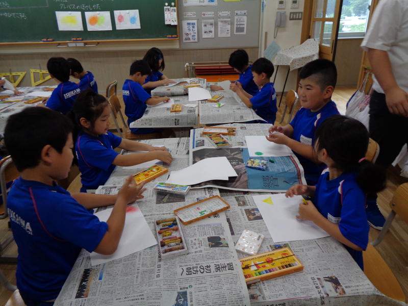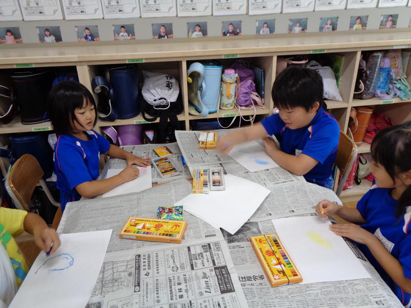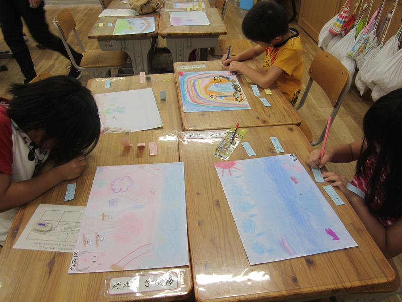 2019年7月12日 12時48分ぼかし遊びを行っている様子です。カラフルなコンテで模様を描き、ティッシュや指でぼかしを入れます。子ども達は喜んで活動していました。
