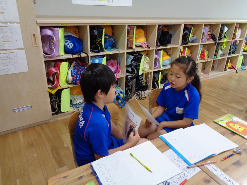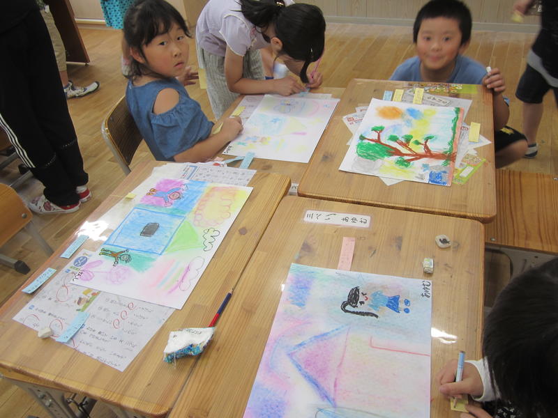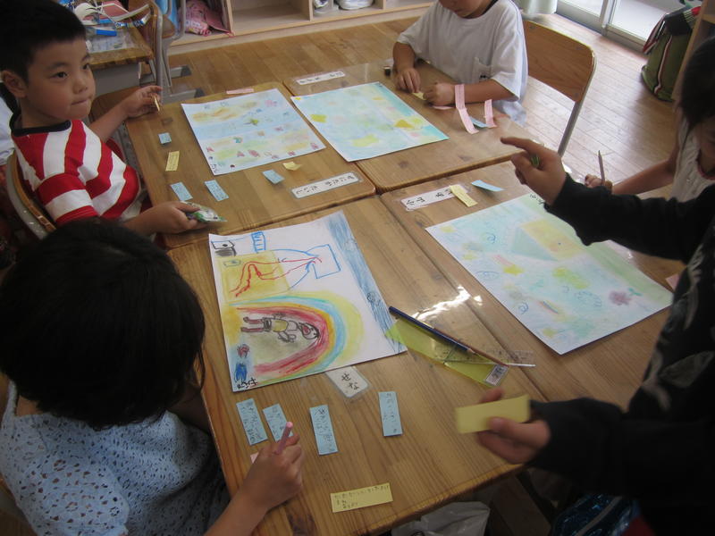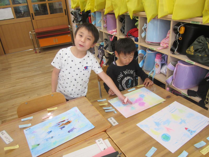 絵に描いた自分の大切なものを隣のお友達に、理由をつけて話しています。