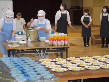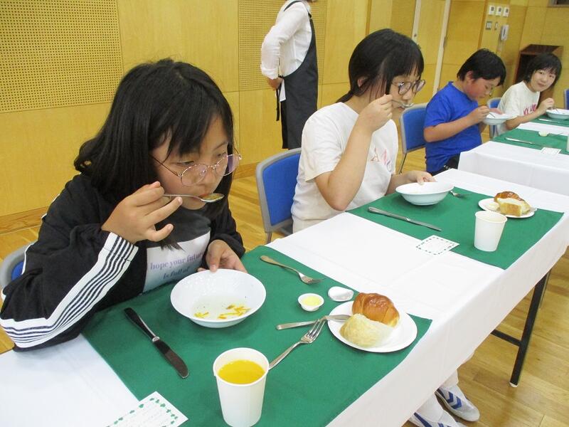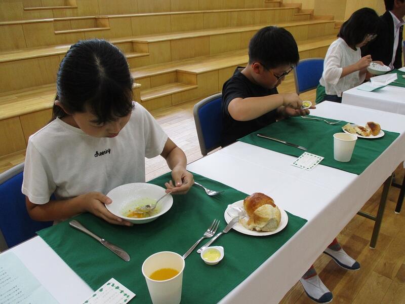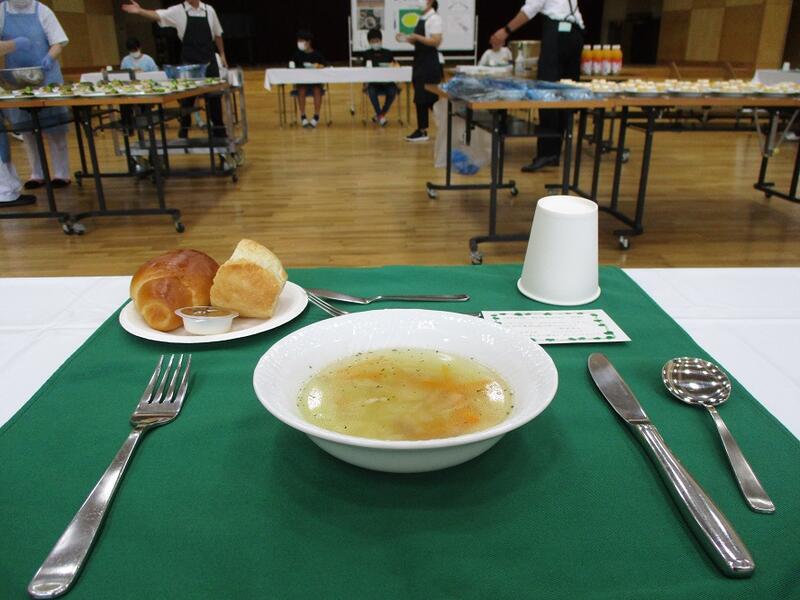 今回のメインディッシュはなんと、はちみつ牛を使ったハンバーグステーキ。サラダ、スープ、パンにデザートもつくコース料理です。ホール担当はこれまたびっくりの先生方。緊張しながらも,おいしくいただきました。
