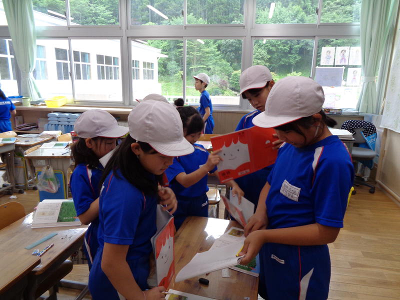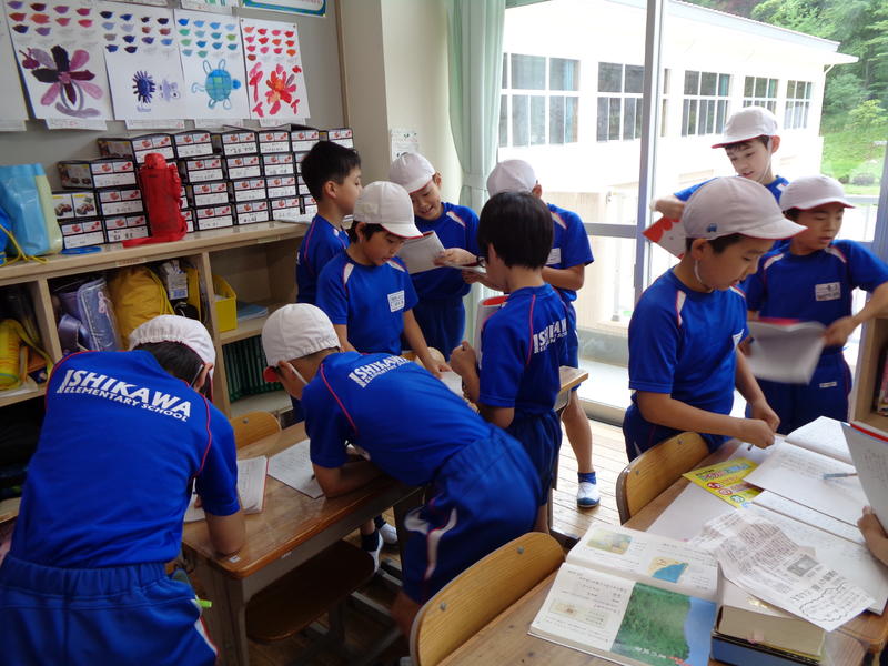夏の季語を使った俳句を一人何首か作りました。その中から短冊に書く俳句をどれにするか友達と相談しながら考えている様子です。