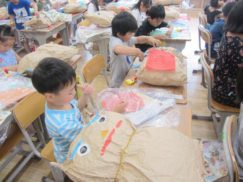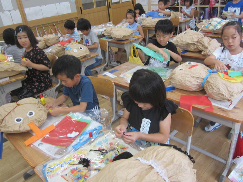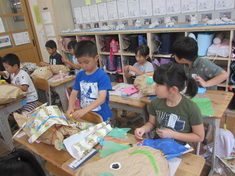 2年生では、袋を使って、動物や魚などの生き物を作っていました。形もとてもよくできていて、飾り付けもとれもカラフルに行っていました。