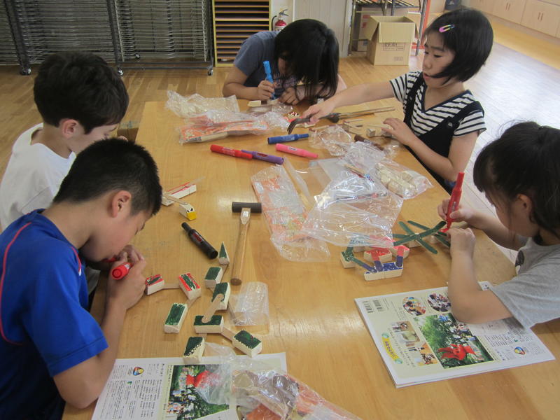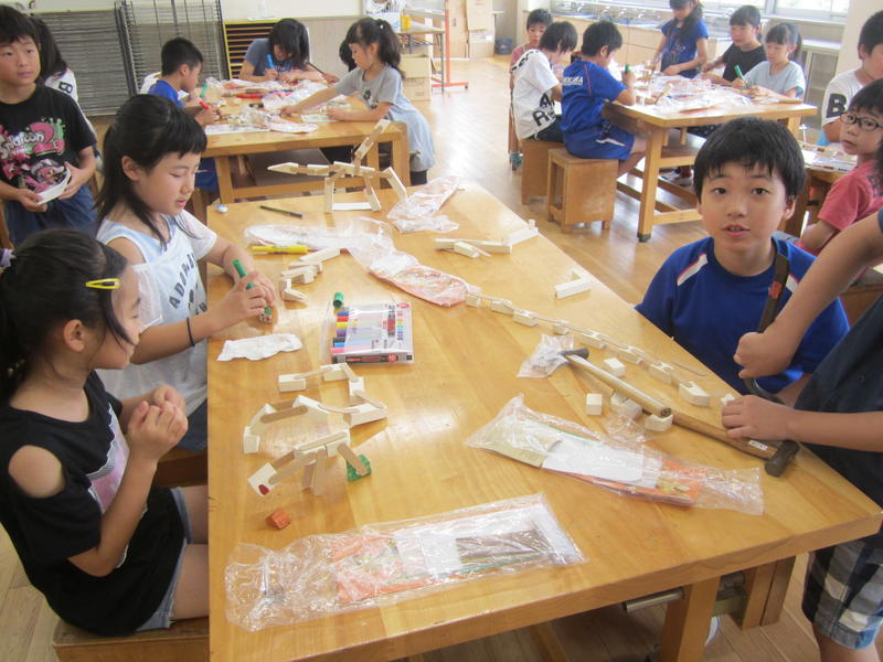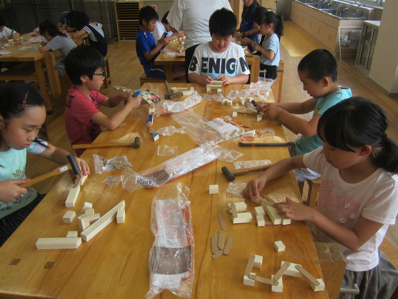 4年生では、木を切ったり、釘を使ってつなげたりしながら、様々なものを作っていました。釘を打つのも結構みんな上手でした。