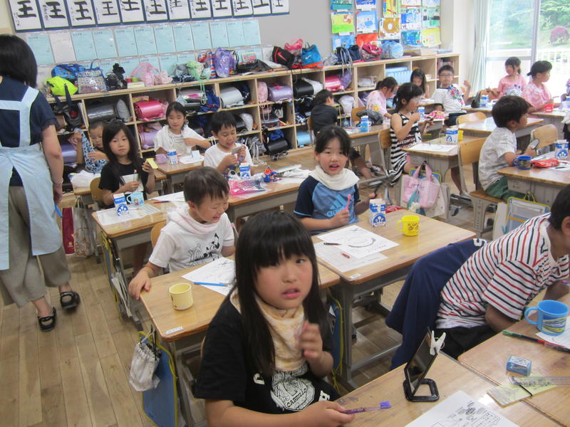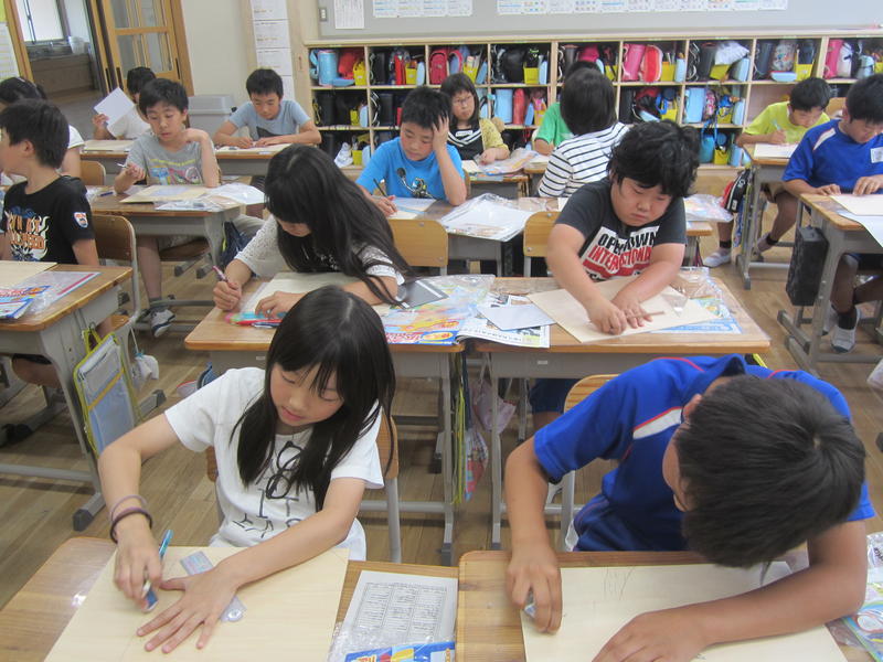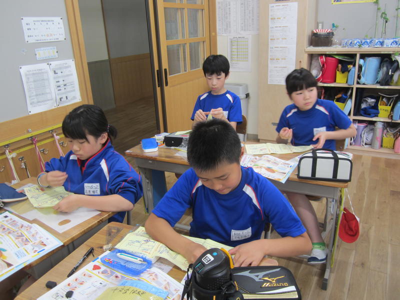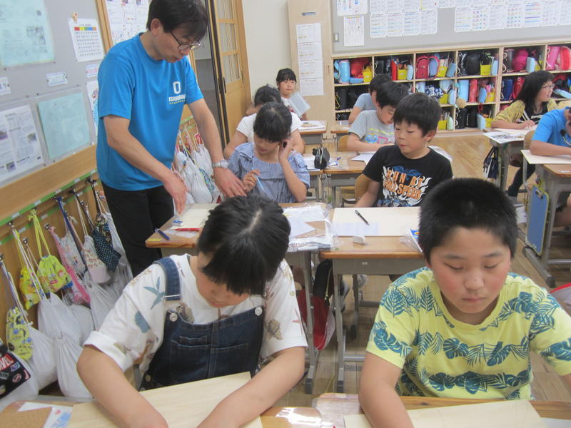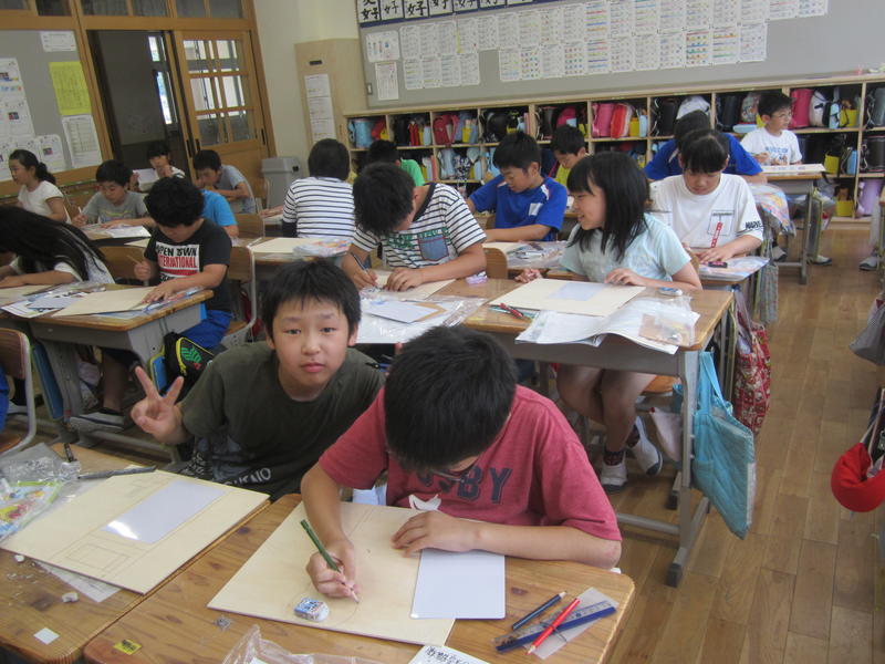 5年生では、掲示板の作成に取りかかっていました。今日は下書きです。板の上に下書きしたら、電動のこぎりで板を切っていきます。教室に掲示板が飾られるのが楽しみです。