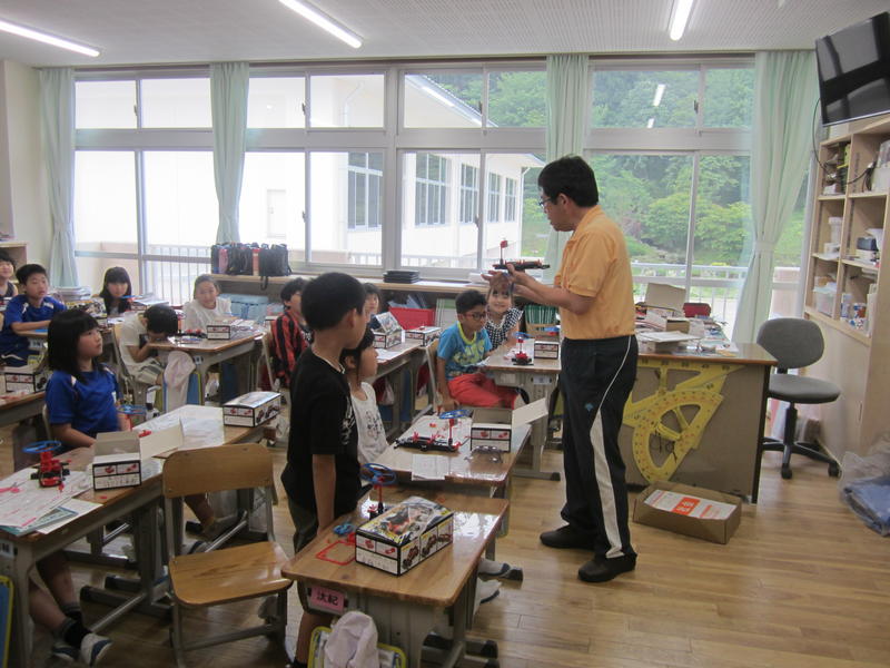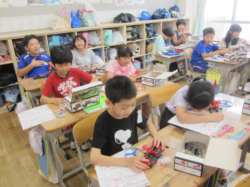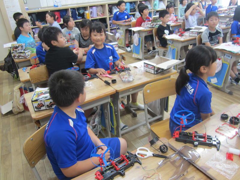 2019年6月27日 15時36分車のセットを使って、電気の働きについて学習しています。電池を入れる向きによって、羽が回る方向が変わることなどを体験していました。