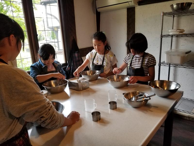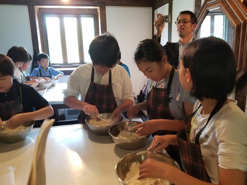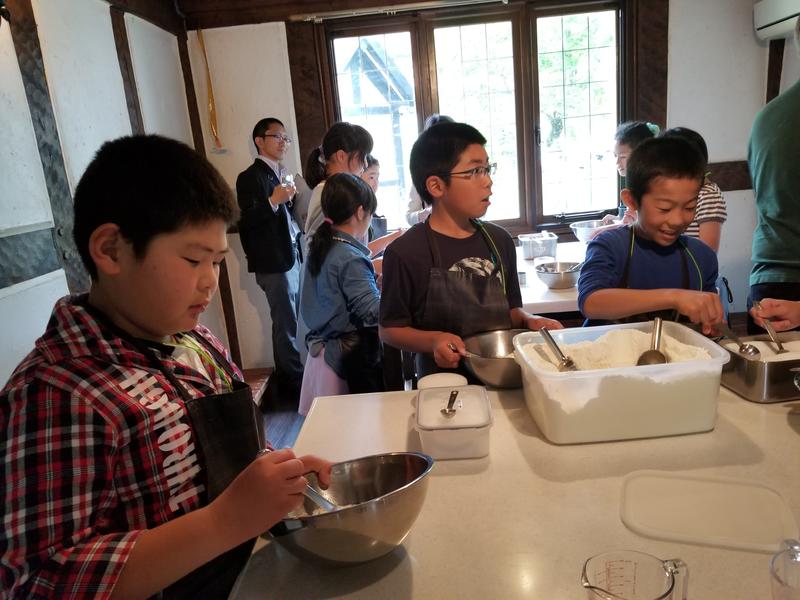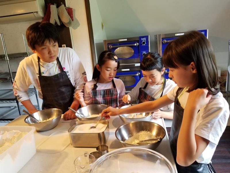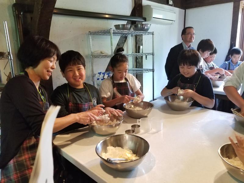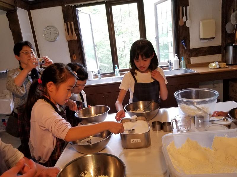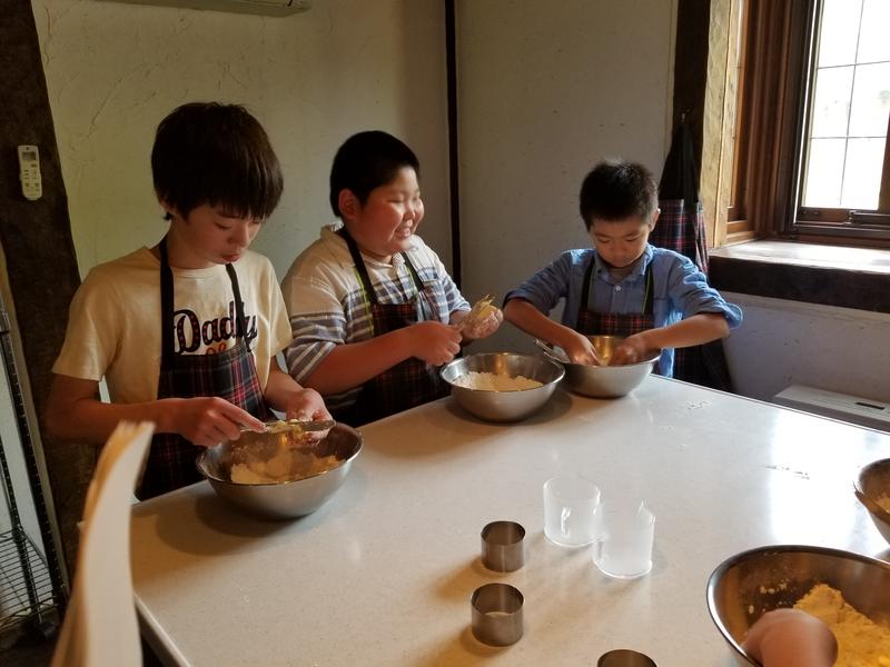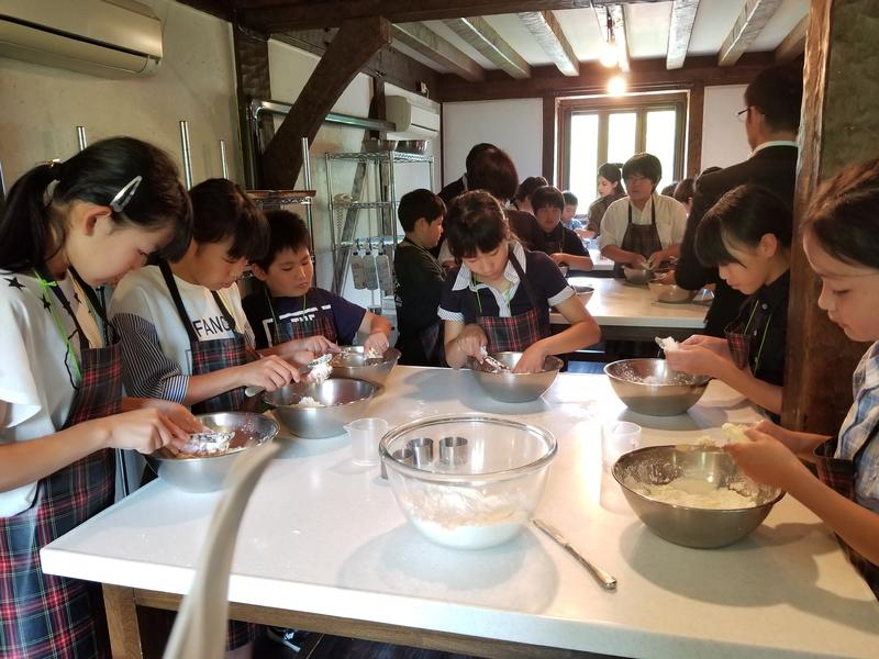 先生の英語での説明を聞いて、みんなで協力してスコーンを作っている様子です。