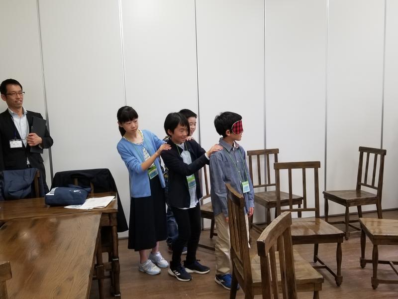 グループごとに、目隠ししている先頭の人を物が置いてある場所に誘導するゲームです。