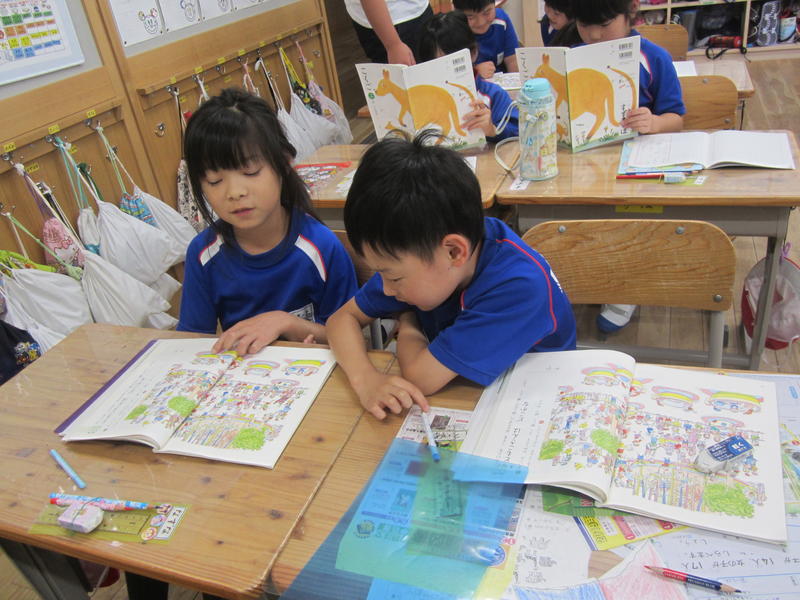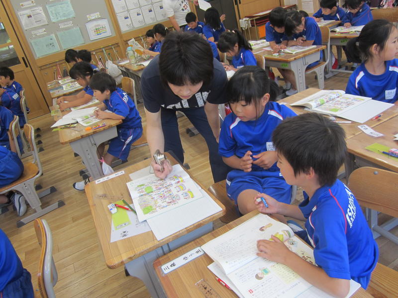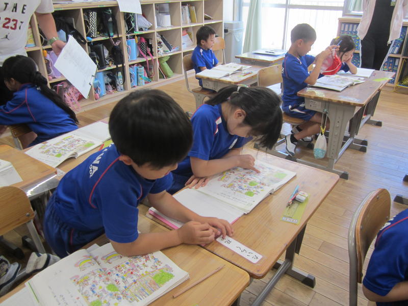 2年2組での国語の授業研究の様子です。迷子探しを通して、大事なことを聞き取ることができる学習です。CDをよく聞いて、友達と話し合いながら絵の中から、迷子になっている子どもを探しました。