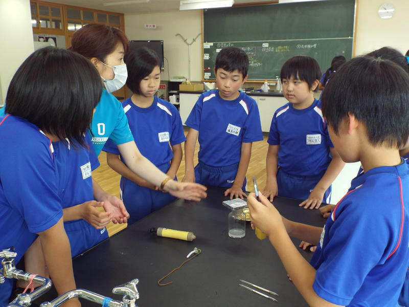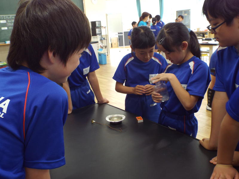 空気が入った集気びんの中にろうそくの火を入れて、気体の変化について調べました。石灰水や気体検知管を使って調べました。どんな変化があったか、ご家庭でもお子さんに聞いてみてください。
