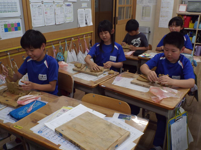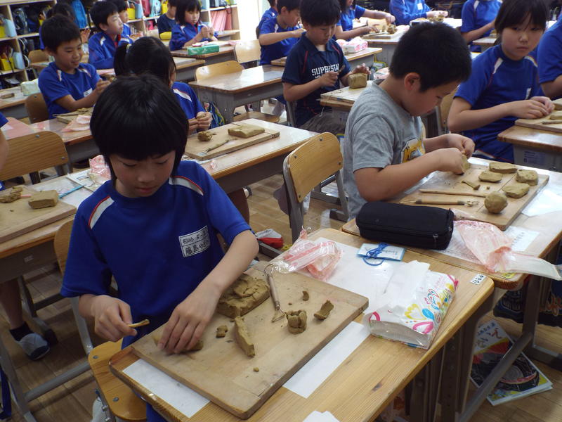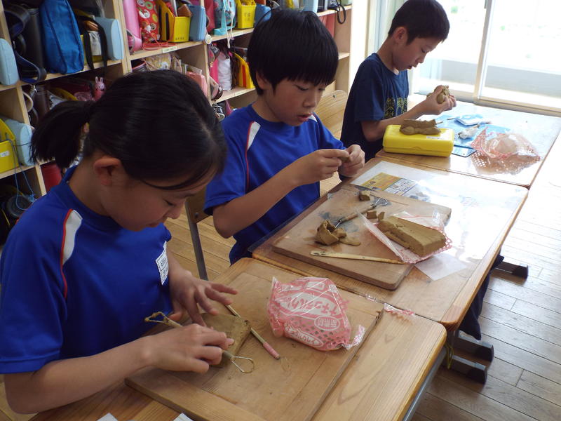 粘土を削ったり、切ったりした形から様々なものを想像して作りました。なかなか高学年になると粘土を使う機会も少ないのですが、みんな集中して作っていました。