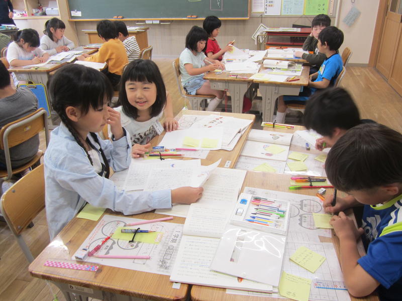 友達と話し合いながら自分が選んだこまについての遊び方などについて書く授業でした。付箋を使いながら書くことを整理していました。