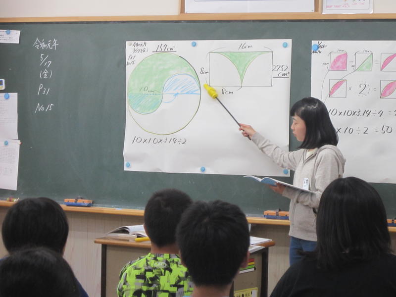 円の複合的な図形の面積を求める学習です。少し頭を働かせなければならない問題でしたが、みんなで練り上げて解決しようとがんばっていました。友達の発表を集中して聞いている様子です。