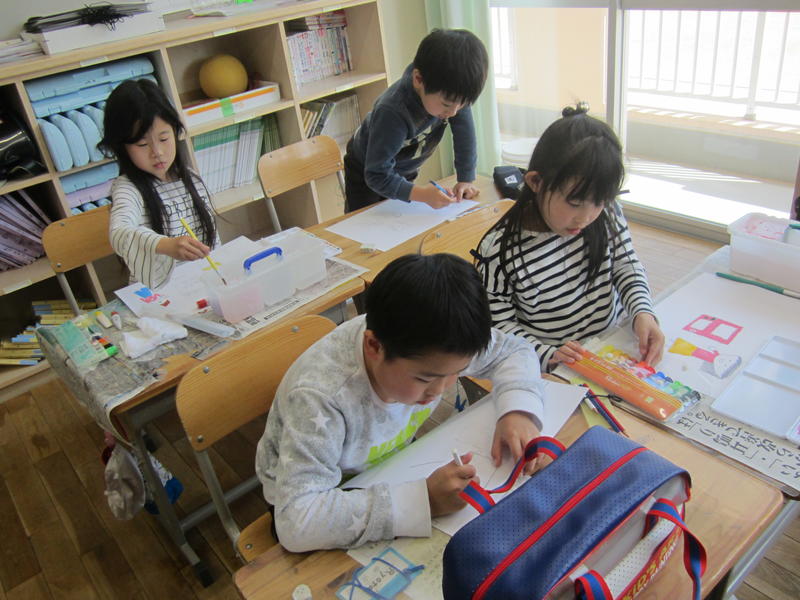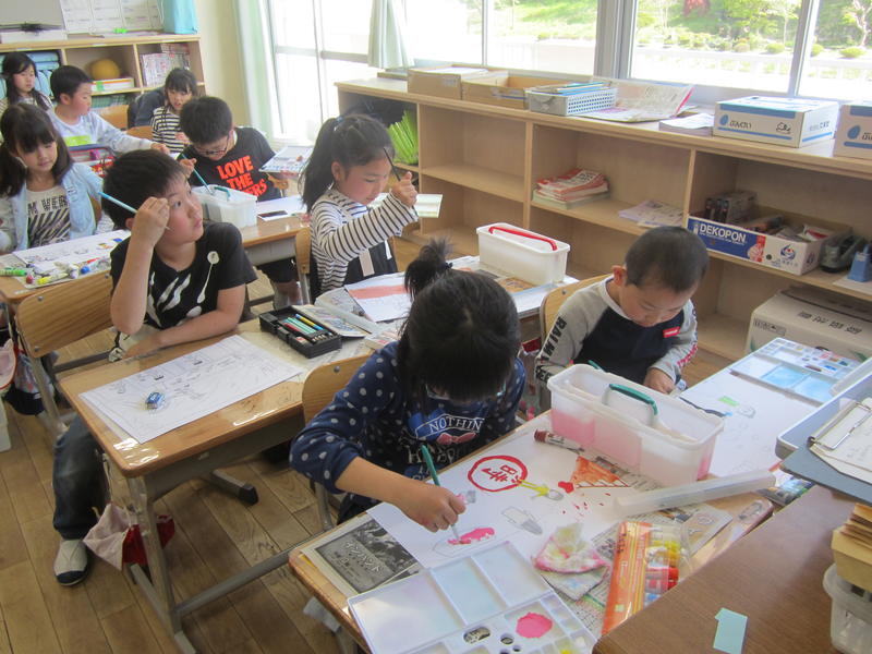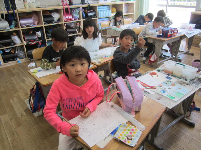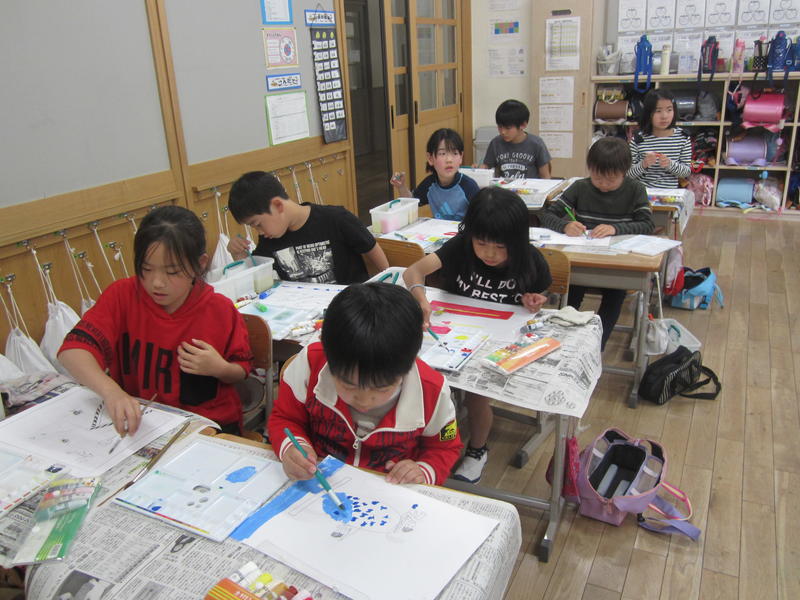 3年生が、図工の学習で5時間目に絵を描いていました。教室に入ると、子ども達が絵の説明をしてくれました。それぞれ、思い思いの絵を描いていました。