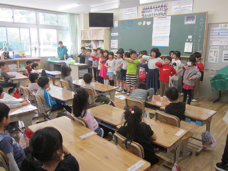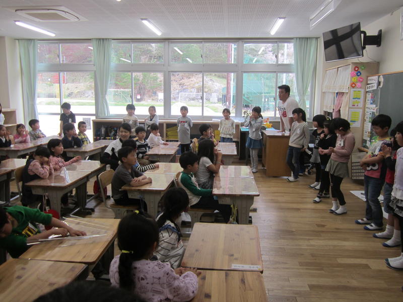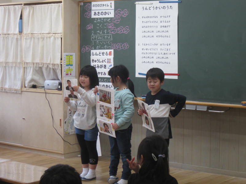 2年生が、1年生の子どもたちに石川小学校について、紹介しました。校長先生や教頭先生や職員室にいる先生を写真を見せながら、名前とどんな仕事をしているのかを紹介したり、運動会の歌を教えたりしていました。1年生は、2年生の発表を真剣に聞いていました。