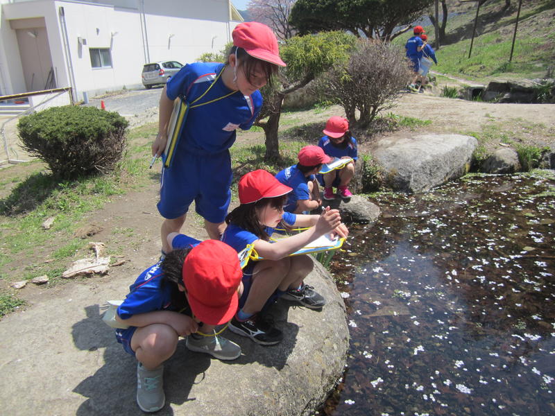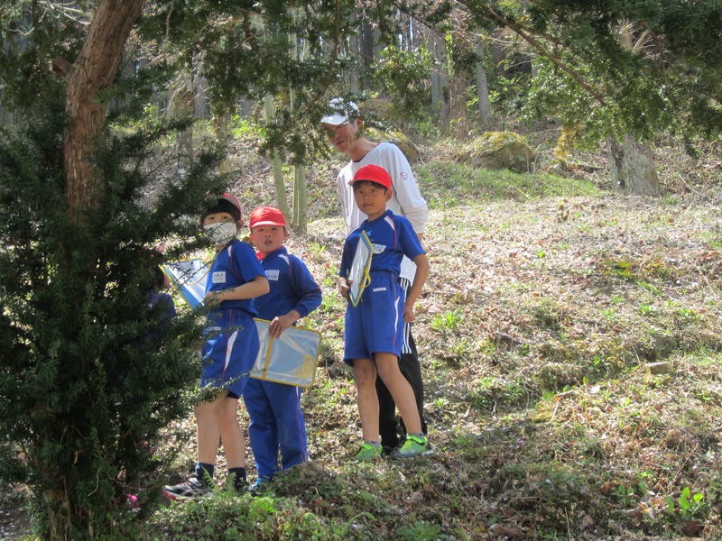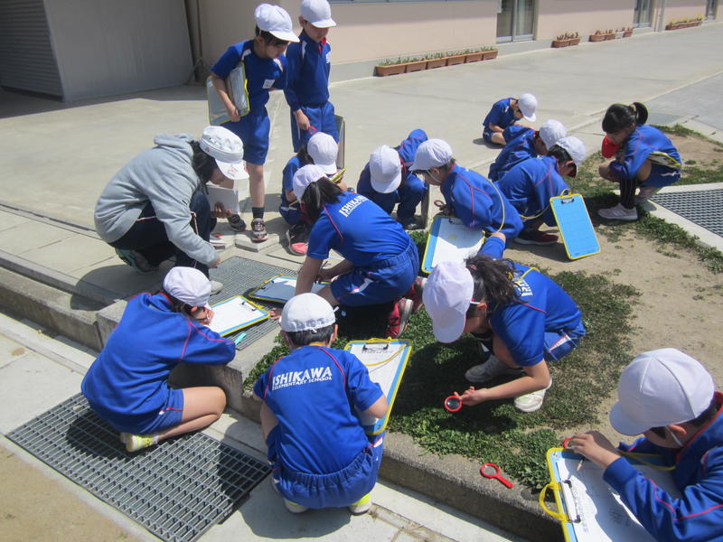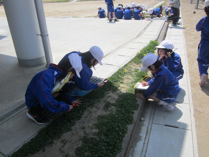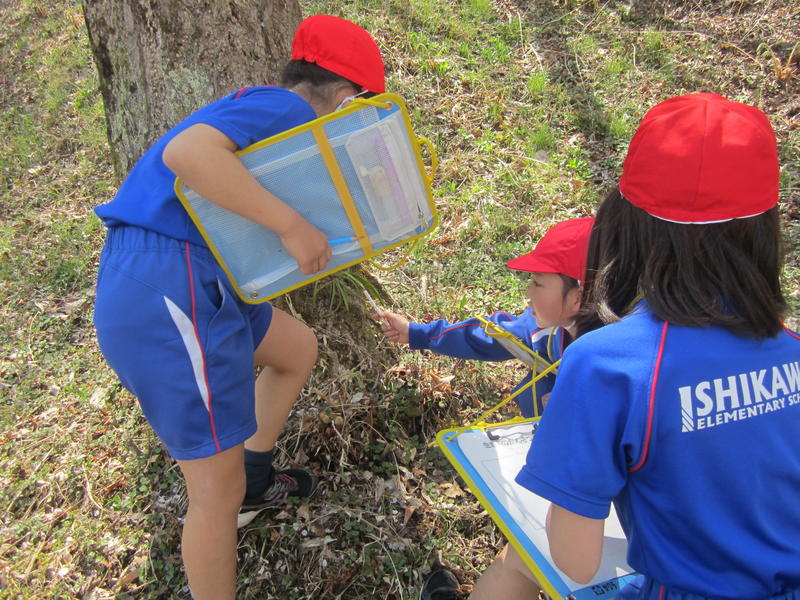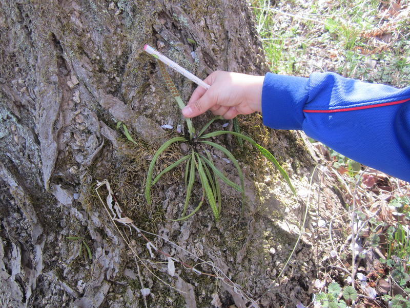3年生が校庭に出て、春の生き物や植物を探していました。木の幹から生えている草を見つけて教えてくれました。その草は、葉の裏側にポツポツの斑点があるのを見つけて、うれしそうにみんなに話していました。