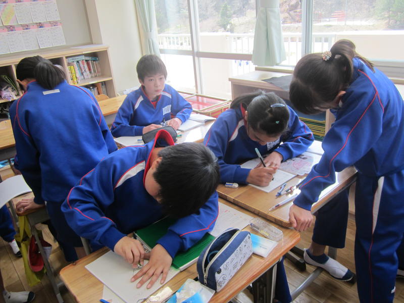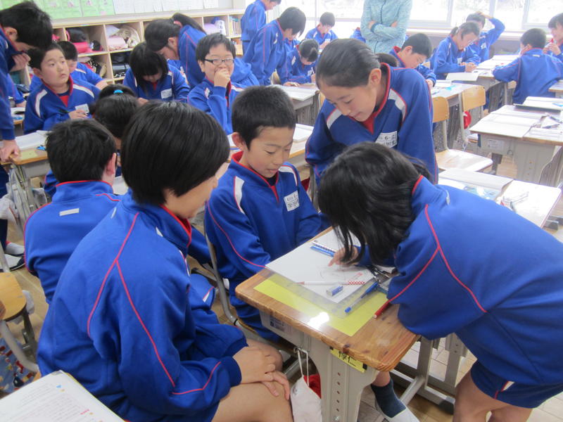 2019年4月22日 12時36分点対称の図形の描き方について学習していました。ちょっと複雑になると点対称の図形を描くのも難しくなります。友達同士で、学び会いながら図形を描いていました。
