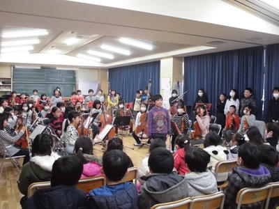 合奏部では、合奏部の演奏を聞き、楽器の演奏体験をしました。