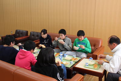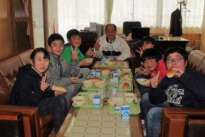 普段入ることのない校長室で、校長先生と一緒に食べる給食は、格別においしいようです。