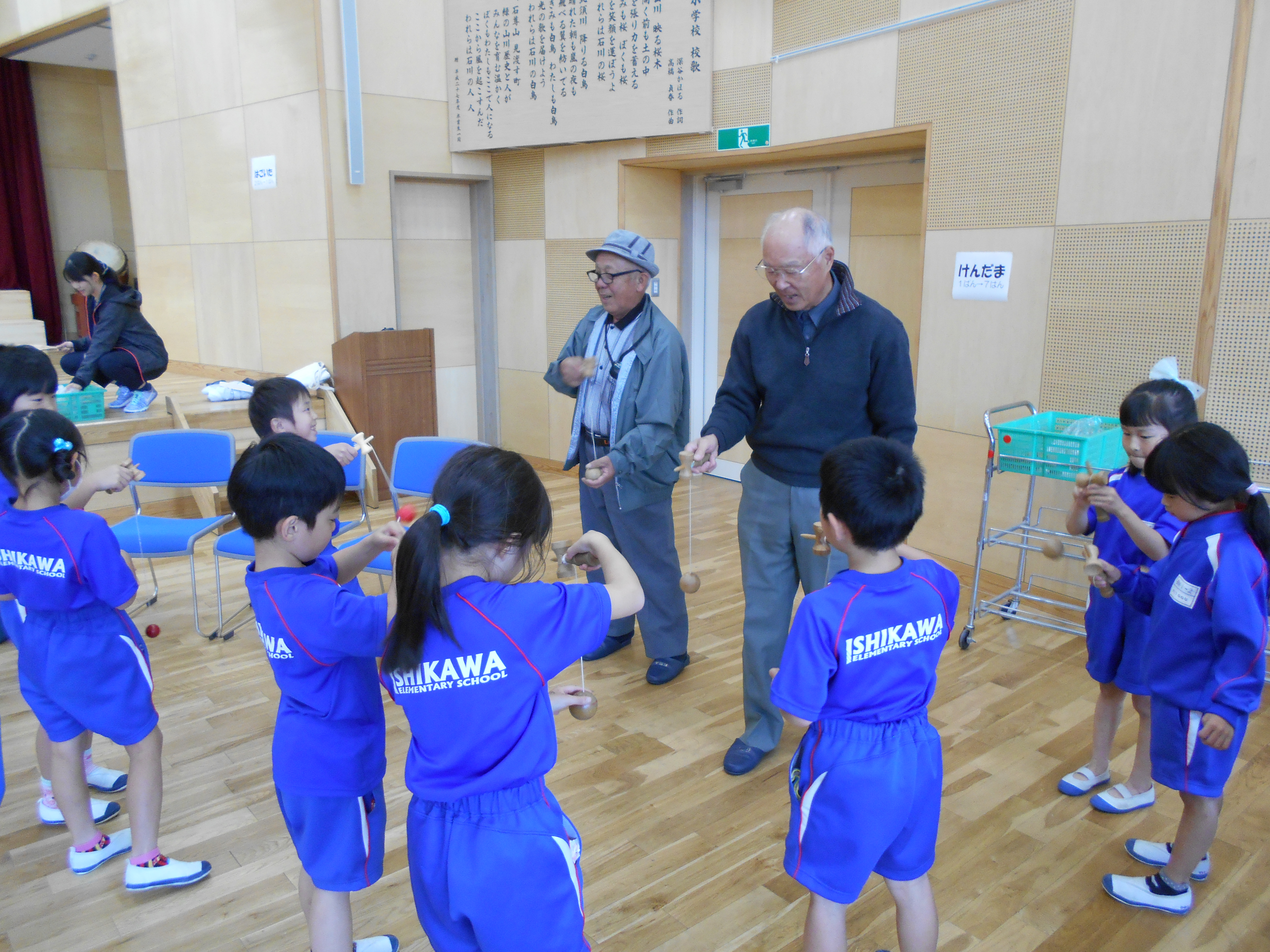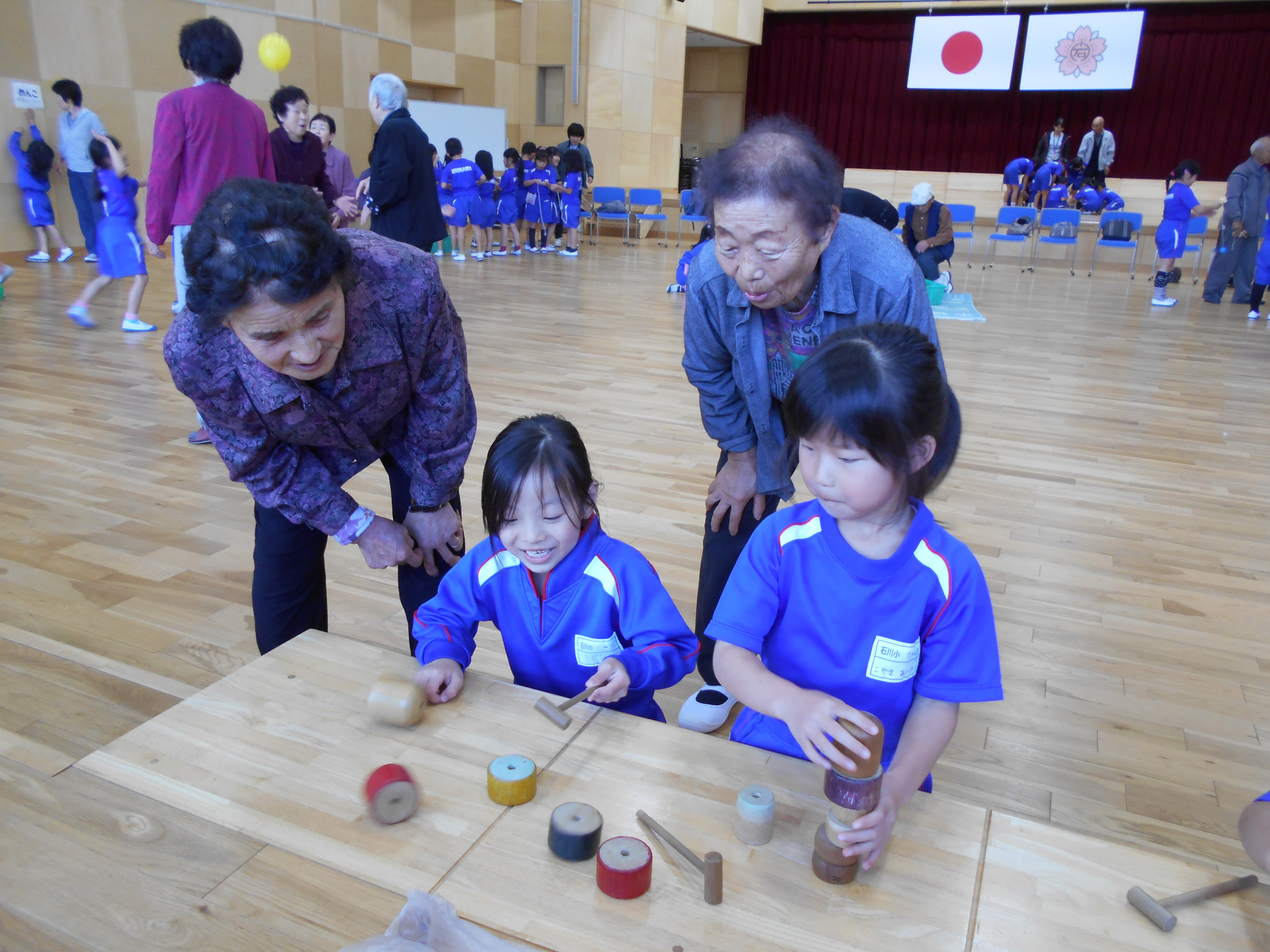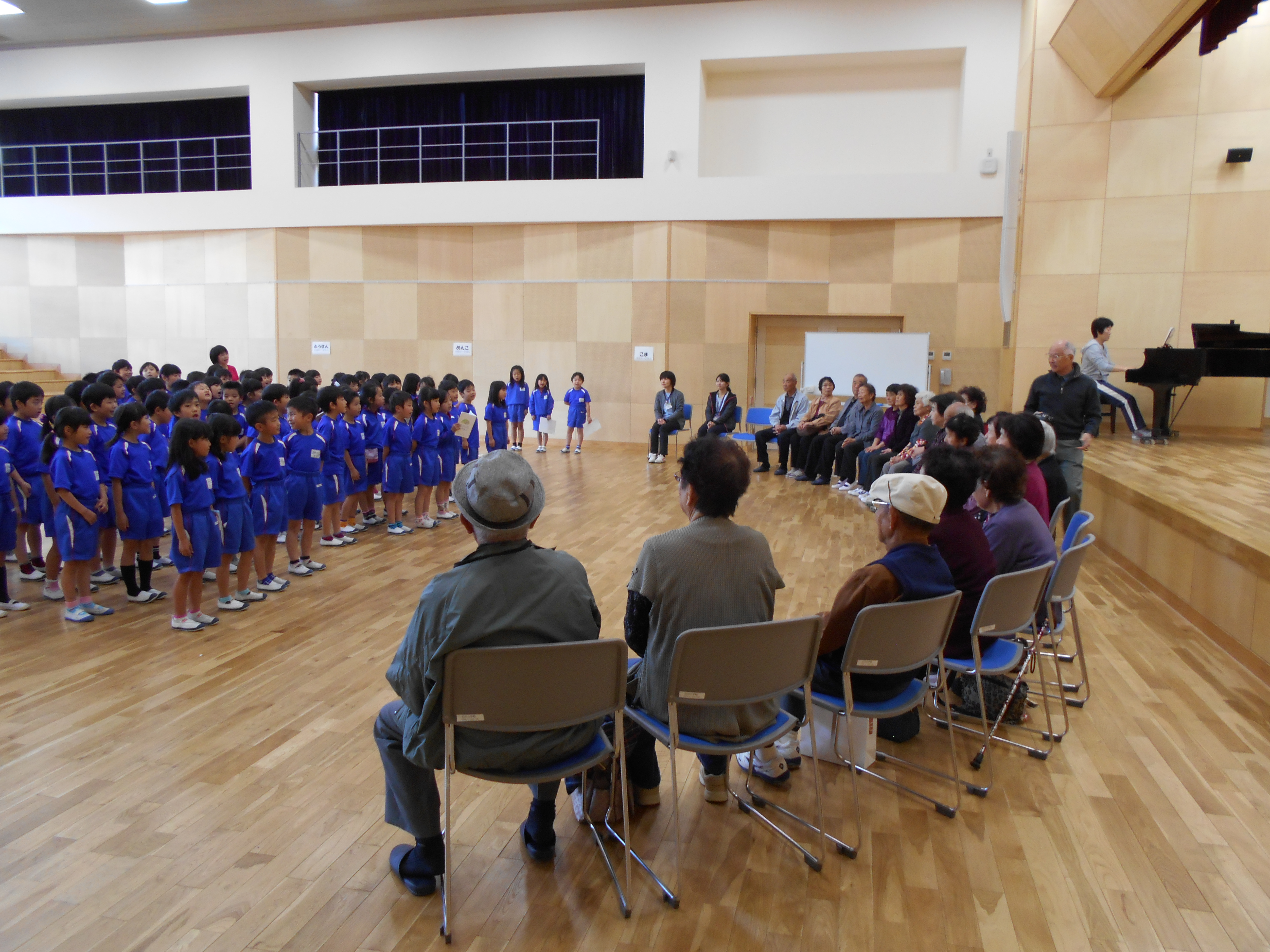 1年生は歌『まっかなあき』を発表したり、おじいちゃん、おばあちゃんと一緒に昔遊びをしたりしました。