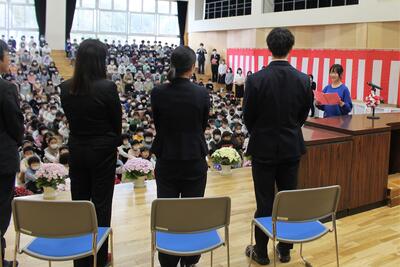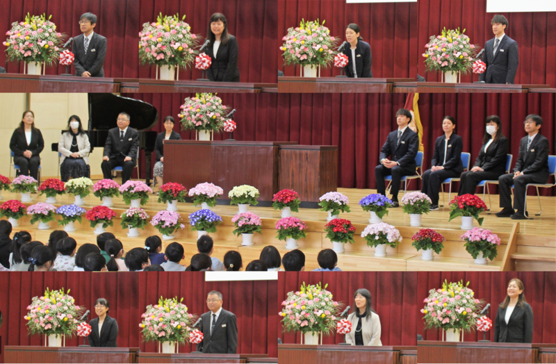 まずは、今年度、石川小学校に転入された8名の先生を紹介する「着任式」が行われました。