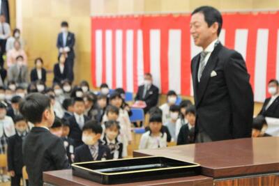 終わったあと、校長先生から「入学おめでとうございます」の一言。さあ、石川小学校に正式に入学です!
