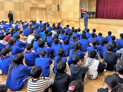 校長先生のお話では、「めちゃくちゃ 楽しい」学校にするという校長先生の目標と、「ありがとう」が言える石川小学校の子どもたちになってほしいというお話がありました。