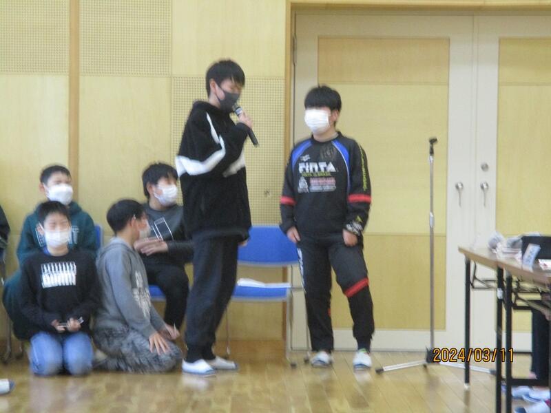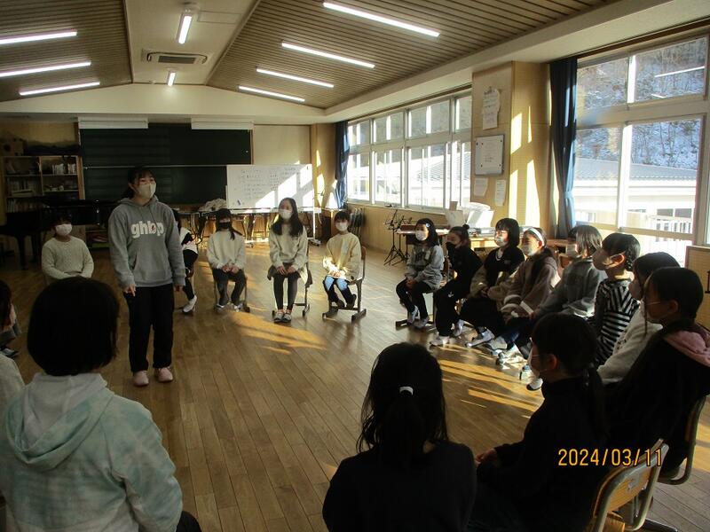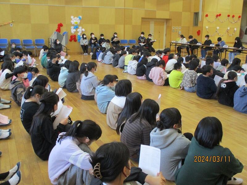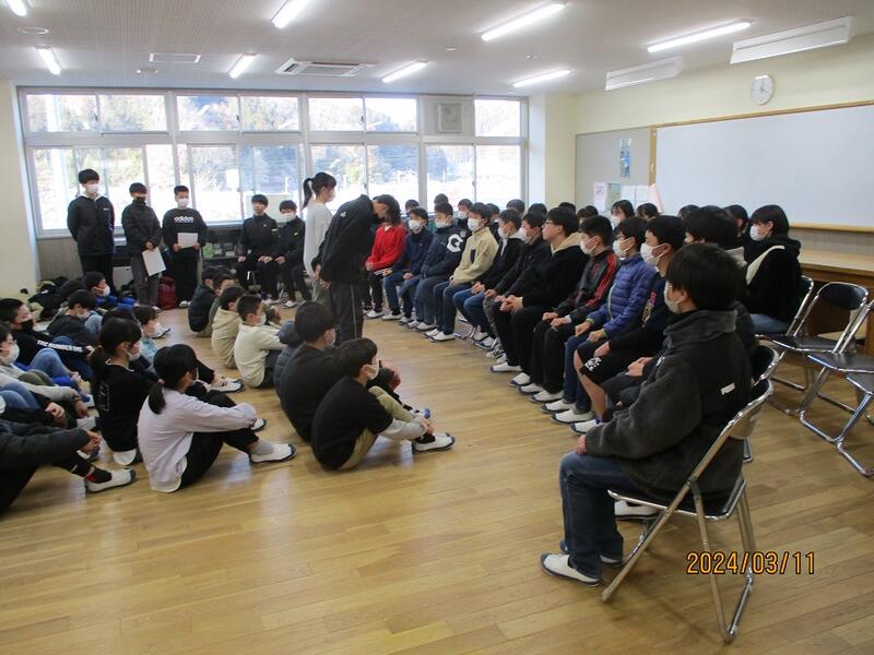 本校の課外活動部は、合唱・合奏・自転車・科学・陸上の5つですが、それぞれに趣向を凝らした送る会が実施されました。ゲームあり、お笑いあり、もちろん厳粛なセレモニーも行いました。
