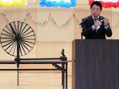 校長先生のお話では、1年生国語科の「たぬきの糸車」に出てくる「糸車(実物を用意しました!)」をきっかけに、糸を「紡ぐ」=1年間の学級、学年のよさやがんばりを「紡ぐ」ことについてお話がありました。