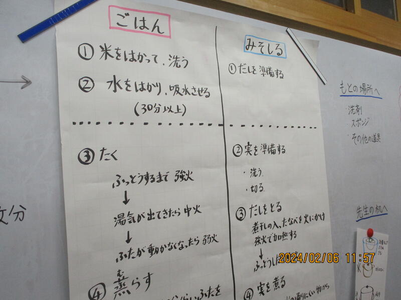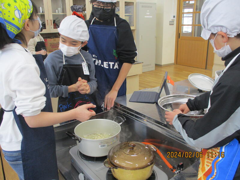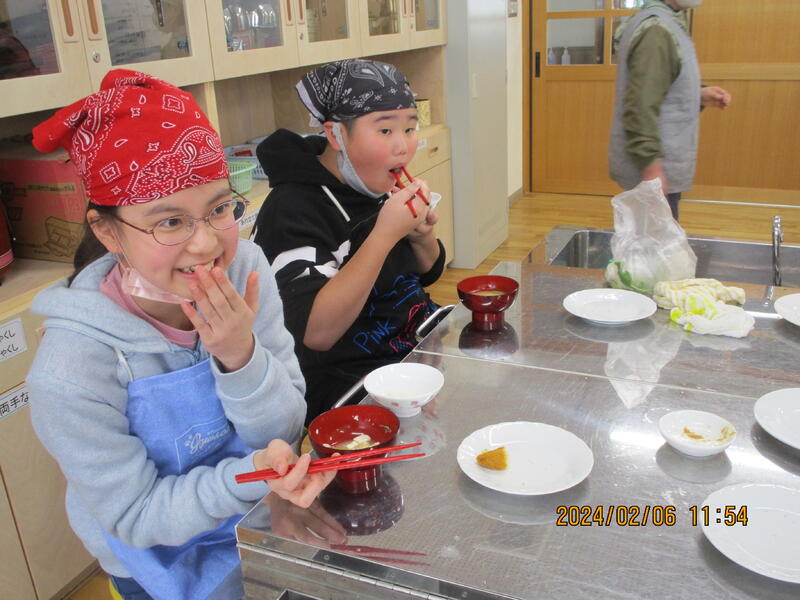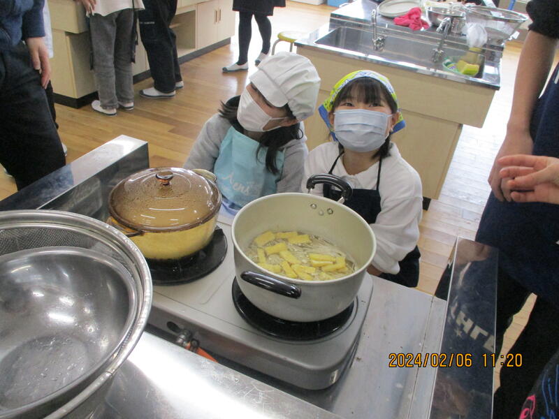 今週5年生は、各クラスごとに「田んぼ収穫祭」と題して、家庭科の調理実習もかねて、春から取り組んできた稲作のまとめの授業を行いました。メニューは、味噌汁とご飯というきわめてシンプル。しかし、味噌汁は煮干しから出汁をとるこだわりよう。なんと言ってもお米は自分たちで田んぼで育てた、コ・シ・ヒ・カ・リ。炊きたてのコシヒカリについつい笑顔が飛び出します。