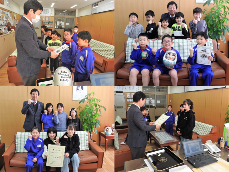 2024年2月13日 18時42分校長室でサッカー「第48回みちのくカップフットサル大会U-8の部」とミニバスケットボール「第36回県南地区U12部会新人戦」の表彰が行われました。