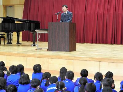 校長先生のお話では、本日、朝の雪の中での登校見まもりの時に、通りかかる小学生、中学生から、朝のあいさつだけではなく「ありがとう」の言葉もあって、心がぽかぽかと温かくなったというお話がありました。また、通学路の歩道が除雪されていたこと、つまり、自分たちの見えない所で働く人がいること、周りの人がみんなを支えてくれているというお話がありました。