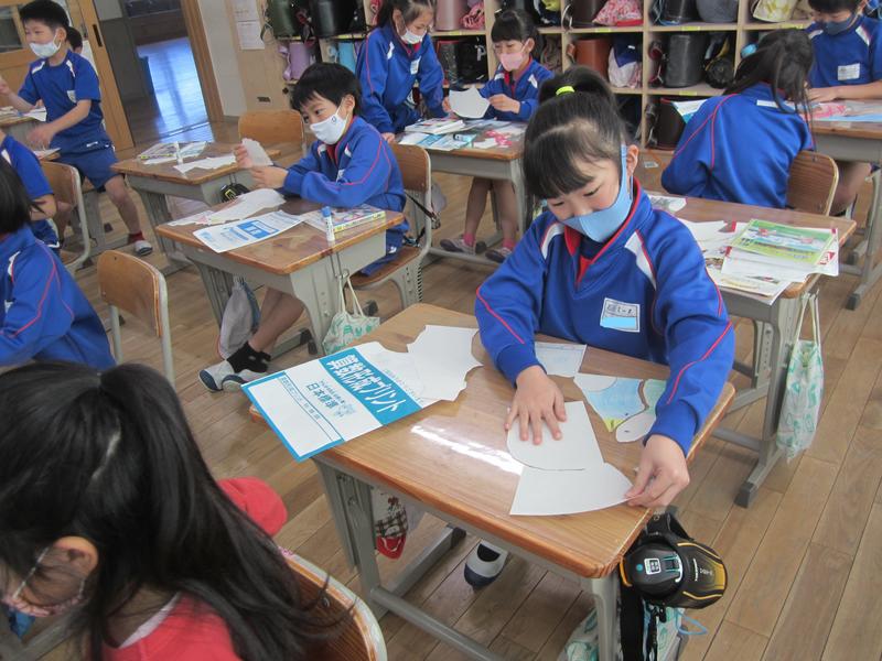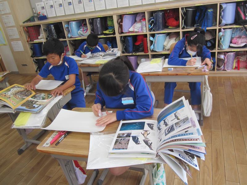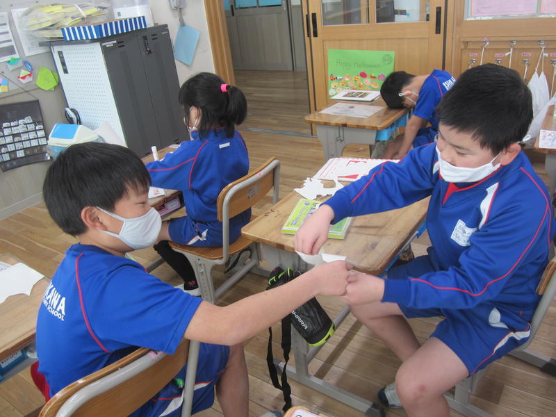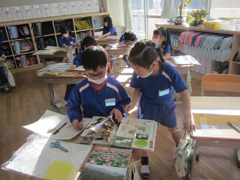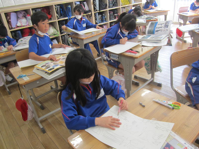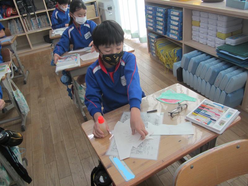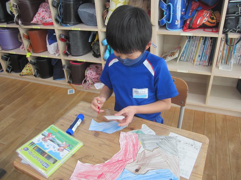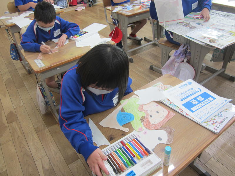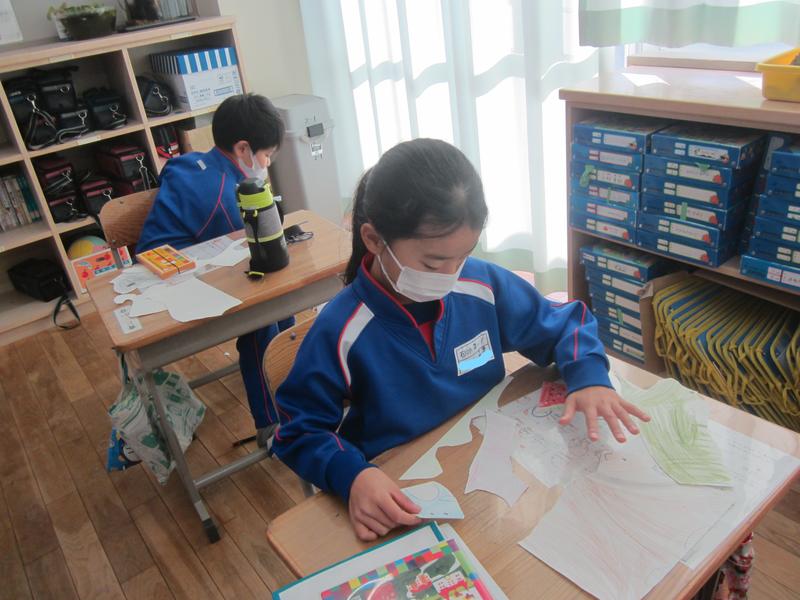 自由に紙を切った形から想像して、絵を描きました。また、他のクラスでは、ステンシルによる版画に取り組んでいました。