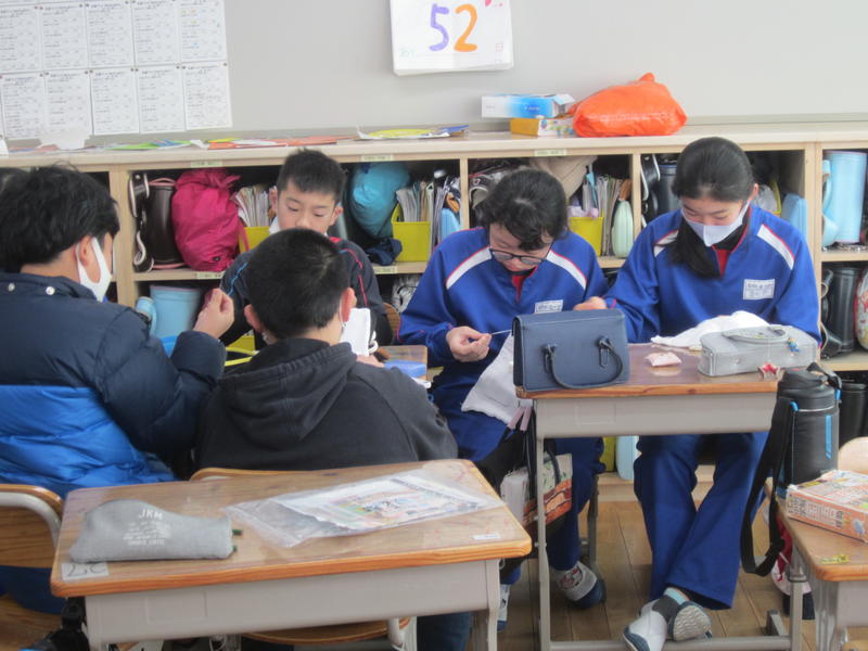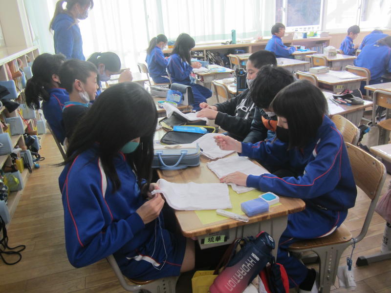 トートバック作りのミシン縫いをしている様子とぞうきんを手縫いしている様子です。ぞうきんは一人2枚がんばって縫うそうです。