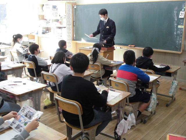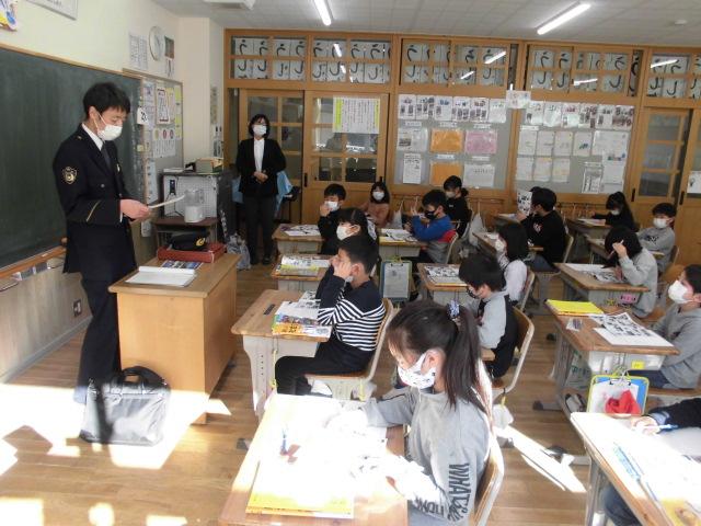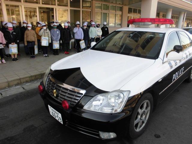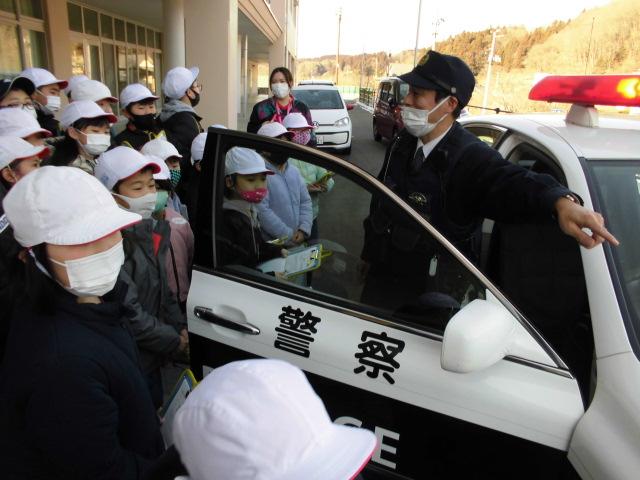 2021年1月21日 10時31分石川警察署から4名のおまわりさんが来て、警察官のお仕事やパトカーの役割、警察官の装備品についてお話をいただきました。パンフレットを見たり、パトカーに乗ったり、装備品をさわったりしながら、警察官の仕事について学習しました。子どもたちは、とても興味を持って授業に参加し、たくさんの質問をしていました。
