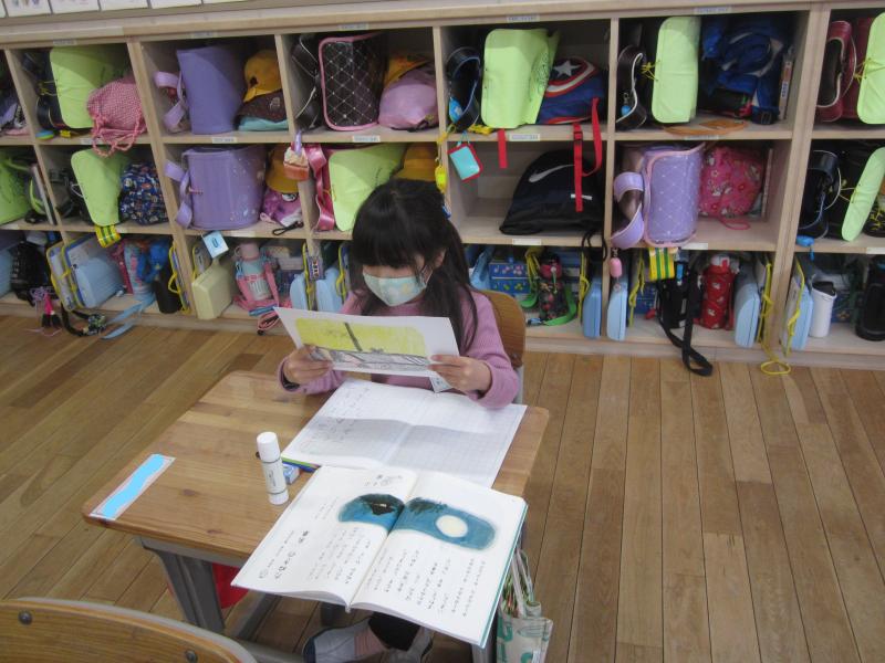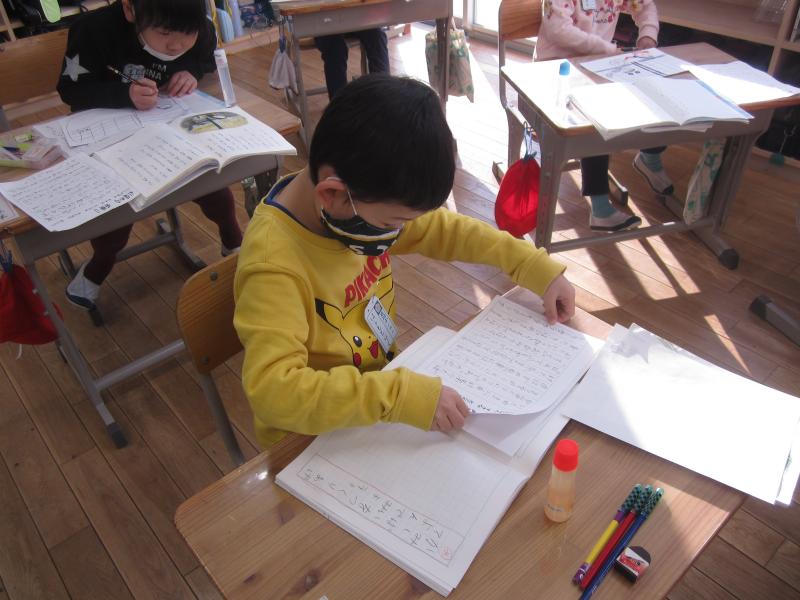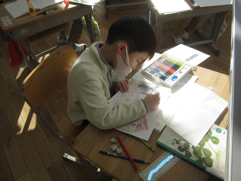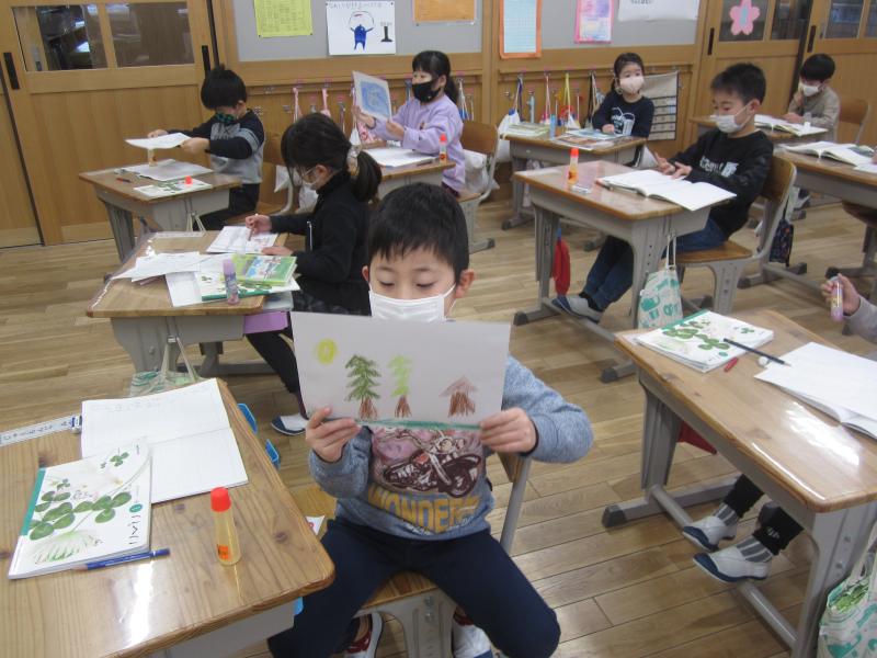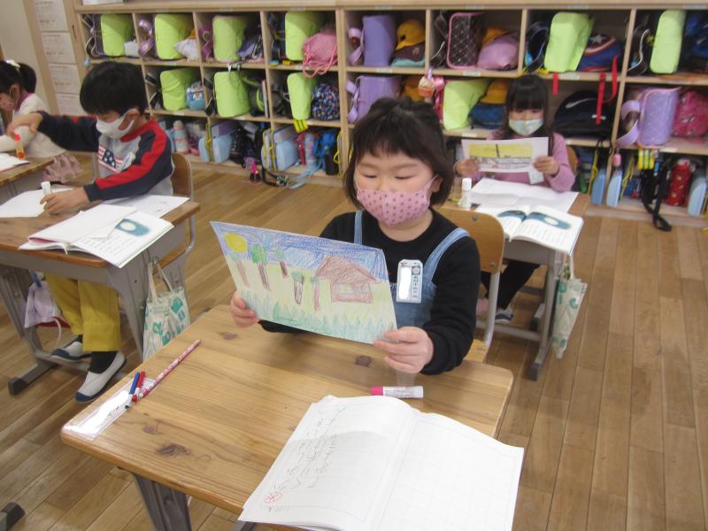 たぬきの糸車 2021年1月22日 11時10分 昔話「たぬきの糸車」を紙しばいにしました。子ども達の絵が、教科書のさし絵さながらにとっても上手に描けていました。紙しばいの後ろに書いた文字もとても丁寧で上手に書けていました。