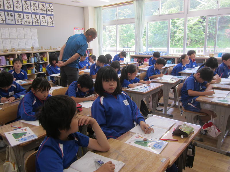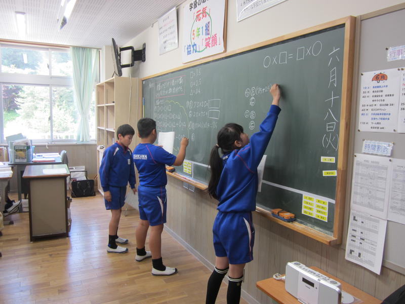 5年生の算数の学習 2019年6月18日 10時29分 計算の決まりについて学習していました。整数で成り立つ計算の決まりが小数の計算でも成り立つかという学習です。黒板に自分の考えを書いて発表しようとしているところです。