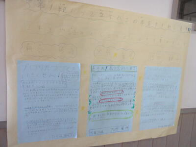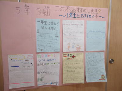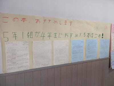 5年生は、国語科の「この本、おすすめします」の学習で、下級生にお薦めの本を紹介しています。お薦めの本を、学年毎に廊下の掲示板に貼りだしています。例えば、1先生「くまのこうちょうせんせい」、2年生「まもれ、きょうりゅうのたまご」、3年生「赤毛のアン」、4年生「11さいのバースディー」などです。これをきっかけに、さらに本に親しむようになるといいですね