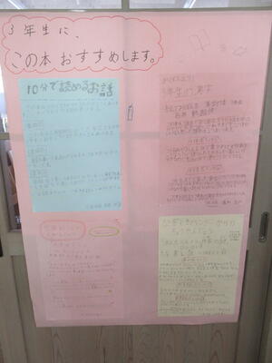 2022年3月9日 14時47分5年生は、国語科の「この本、おすすめします」の学習で、下級生にお薦めの本を紹介しています。お薦めの本を、学年毎に廊下の掲示板に貼りだしています。例えば、1先生「くまのこうちょうせんせい」、2年生「まもれ、きょうりゅうのたまご」、3年生「赤毛のアン」、4年生「11さいのバースディー」などです。これをきっかけに、さらに本に親しむようになるといいですね