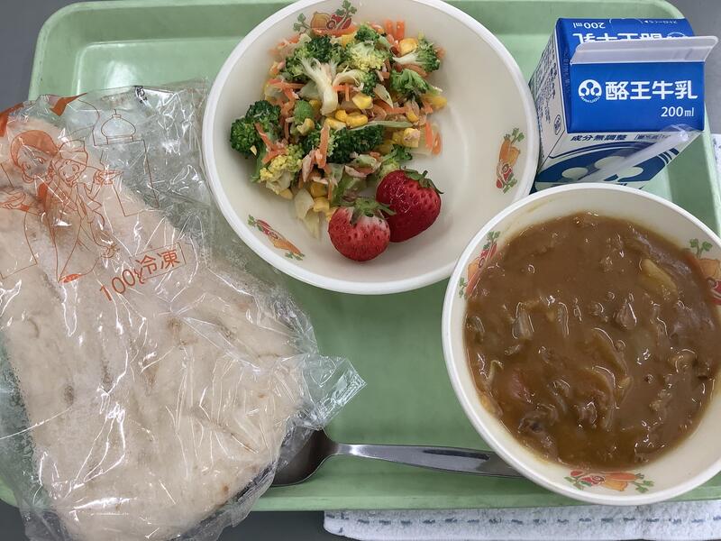 本日の給食は、ナン、ビーフカレー、ツナとブロッコリーのサラダ、いちご、牛乳のメニューでした。きらり1組のみなさんは、おいしくて食べやすいからと、ナンをリクエストしてくれました。普段のパンより平でもっちりしていることや、カレーにつけながら食べるので、食べやすくなるのでしょうね。きらり1組のみなさんありがとうございました。