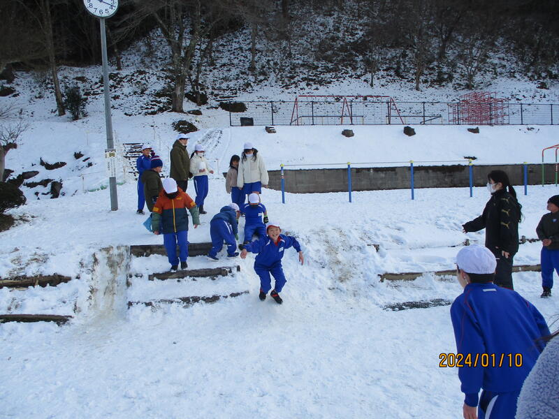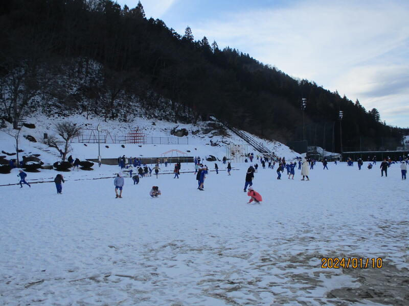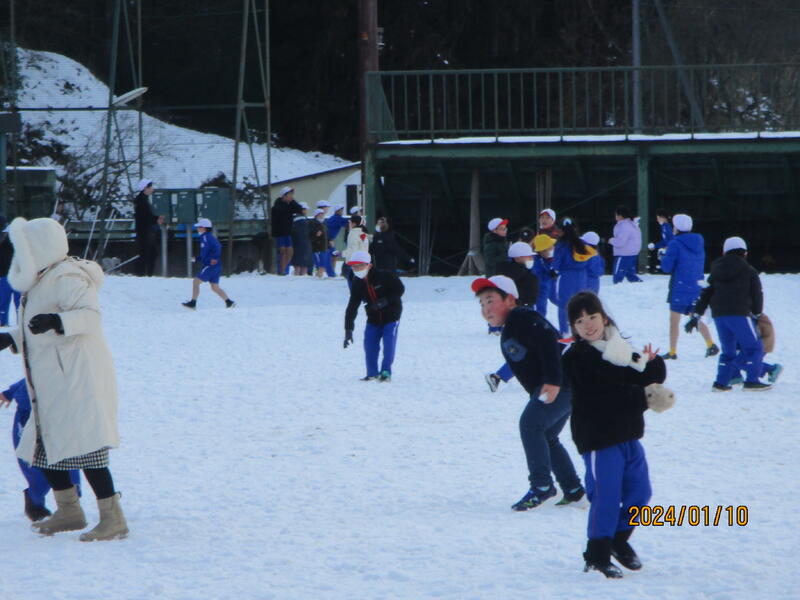 2024年1月11日 16時18分登校前日の大雪のため、校庭はすっぽりと雪に包まれてしまいました。毎朝の通勤が心配ですが、子ども達はそんなことは気にとめる様子などありません。休み時間、早速出てきました湧いてきました!子どもはこうでなくちゃいけません。